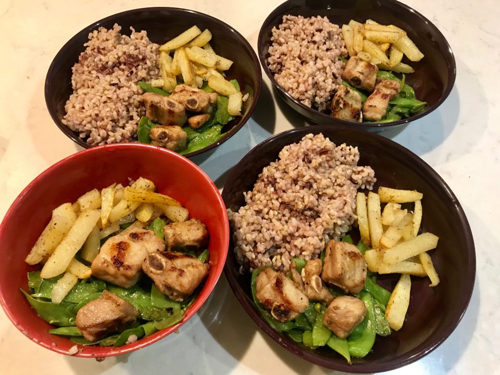Thanks to my friend, I get to know that I can enjoy garlic fries withOUT deep frying them in oil, withOUT air fryer! Besides, 1 box of snow pea is not enough daily veggie supply for 4 people, so I decided to bring out my stock of potato to bring more veggie (and carbs of course) to our meal…!