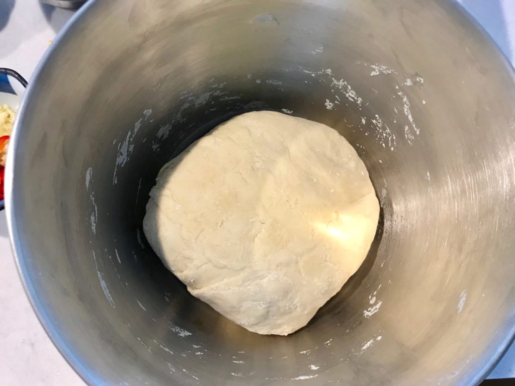 Step 4: After the 1st 30 mins rising, the dough looked smoother, but still rougher than video.