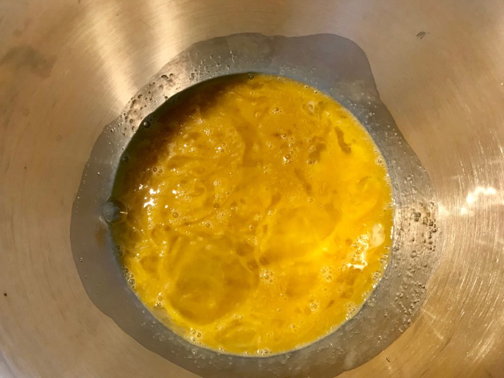 Step 1: Crack 3 eggs (room temperature), sugar 50g, honey/syrup 40g into a bowl