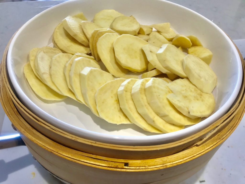 cut sweet potato into slices, easier to steam and mesh Stir till not sticky