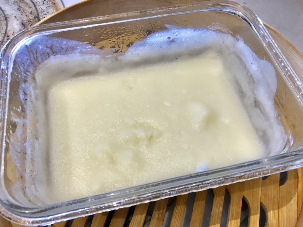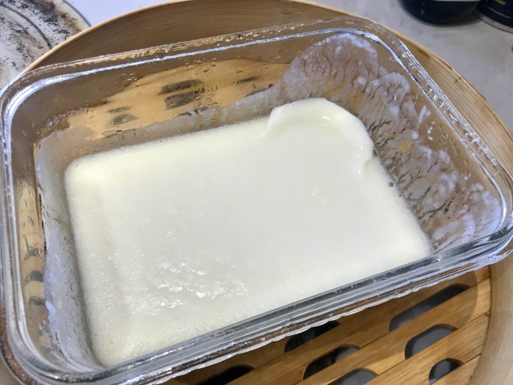 Mochi mix after steaming for 5mins, still some liquid Mochi mix after steaming for 2nd 5mins, no liquid left