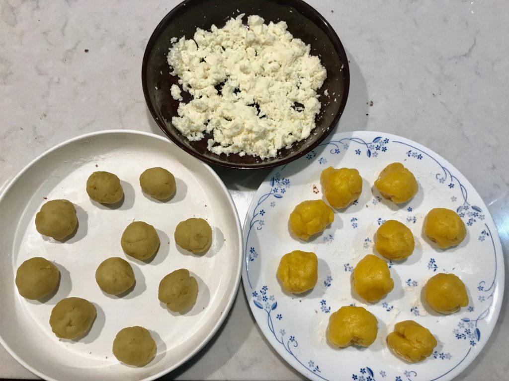 Instruction: – mix and steam 5 mins when water boils – quickly mix – steam for 5 mins or till no more liquid – quickly mix for 1-2 mins or till form a sticky dough – cool for use | Instruction: – smash the steamed sweet potato, transfer in pan – medium heat, add in the rest ingredients – stir till dryer and can stick together (clean pan and spatula) |