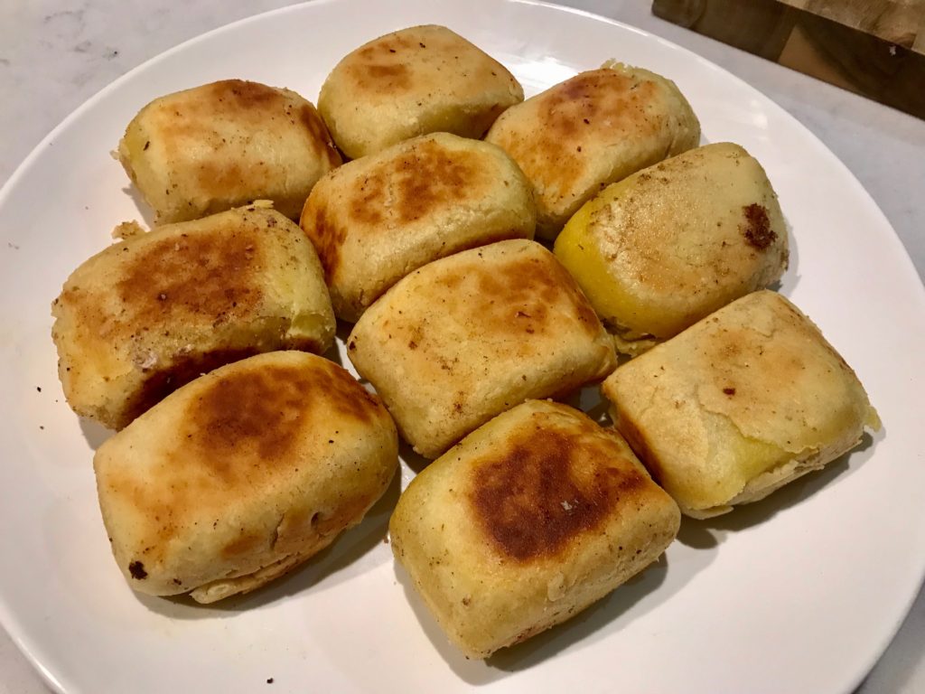 - add these cake pastries into pan, cook every side of the cuboid till slightly brown; if too dry, add water or oil