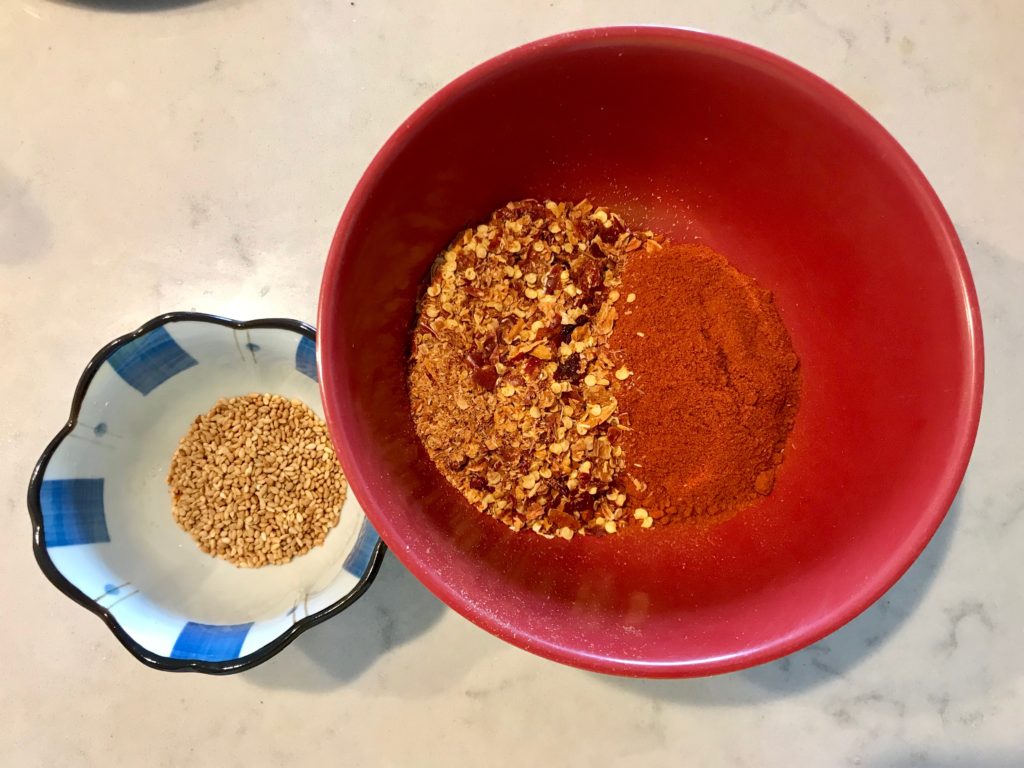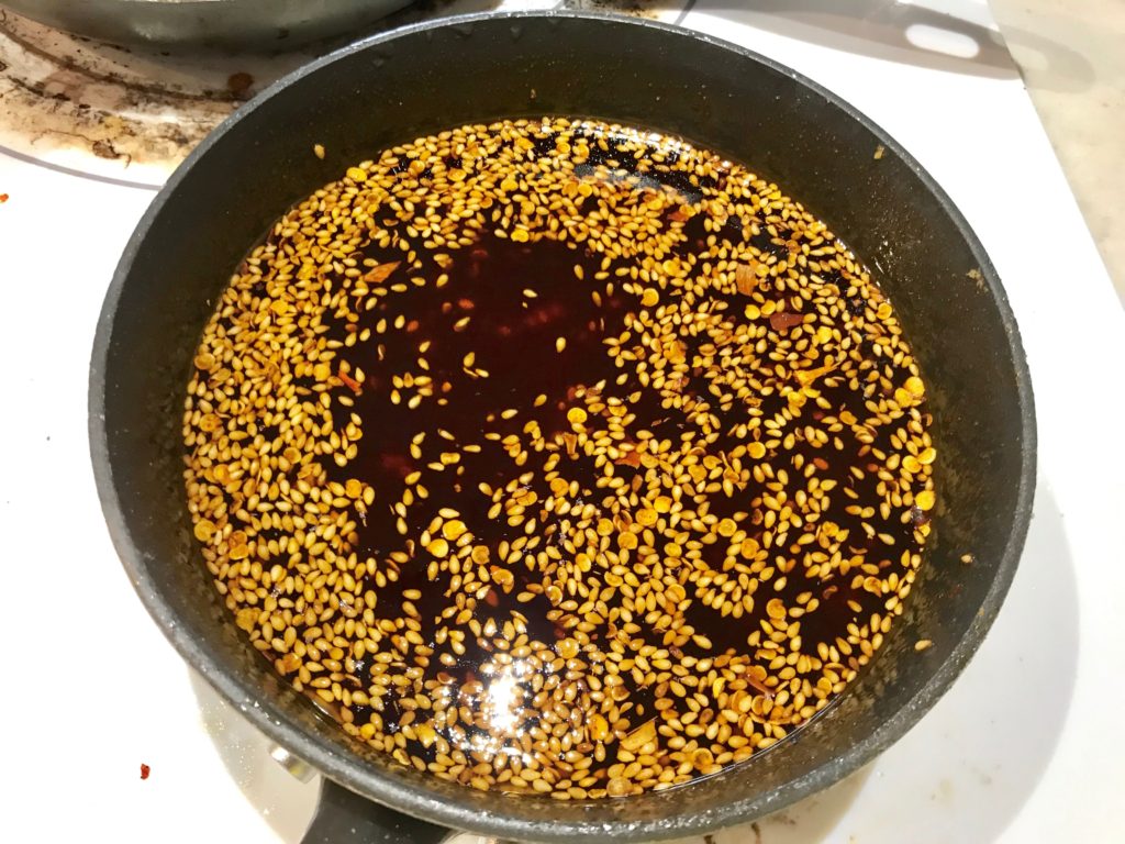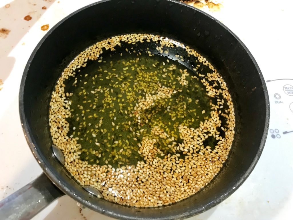 - add sesame in hot oil and let the remaining heat fry sesame for 1 min