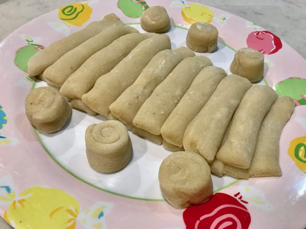 - cut main dough into smaller pieces, roll them from thicker roll into thinner dough