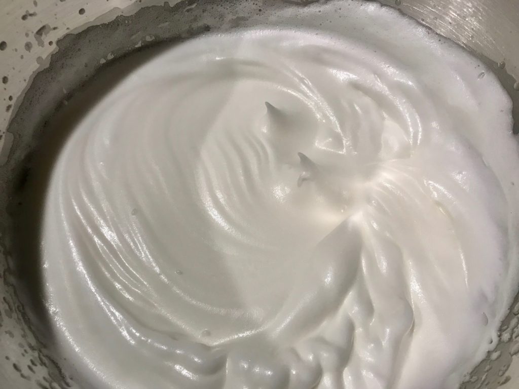 Step 4: Add 1/2 lemon juice to egg white, whisk till firm (tips not falling)