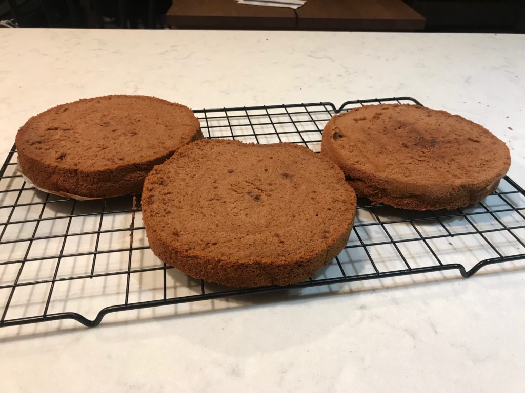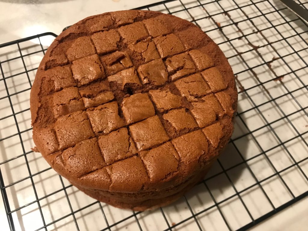 Step 12: cool down: remove from mold if possible (not essential, just faster to cool down), flip cake mold so it’s upside-down till completely cooled. Up-side down helps prevent shrinking as well. You can see the grid’s print on the surface of my cake haha!