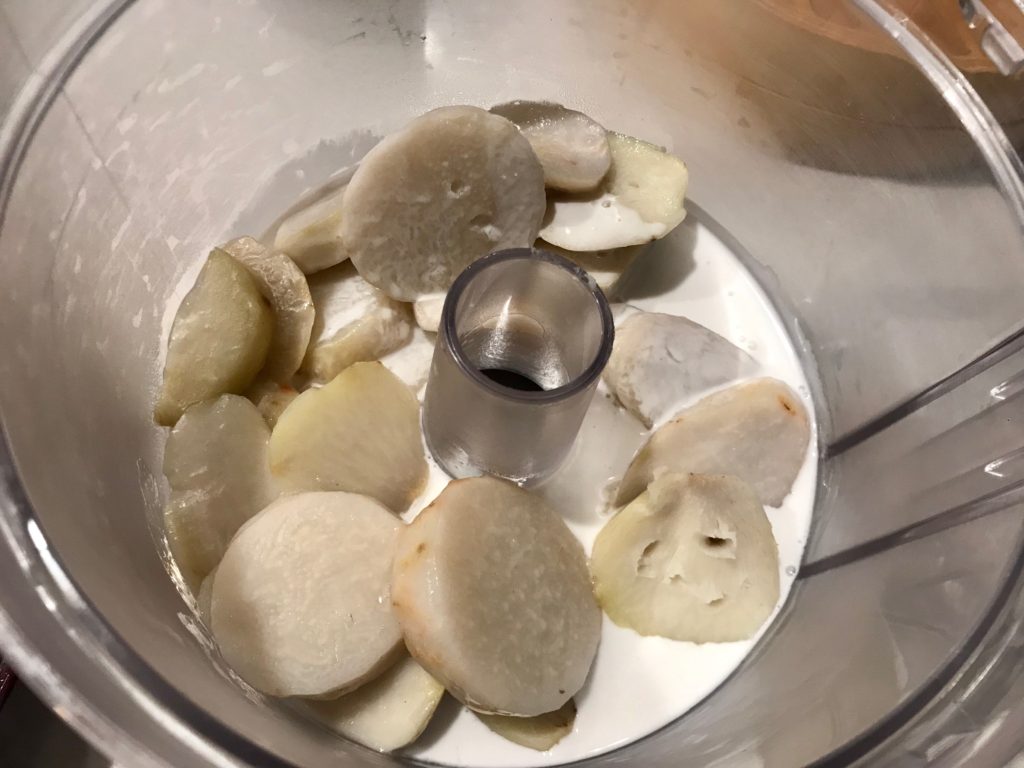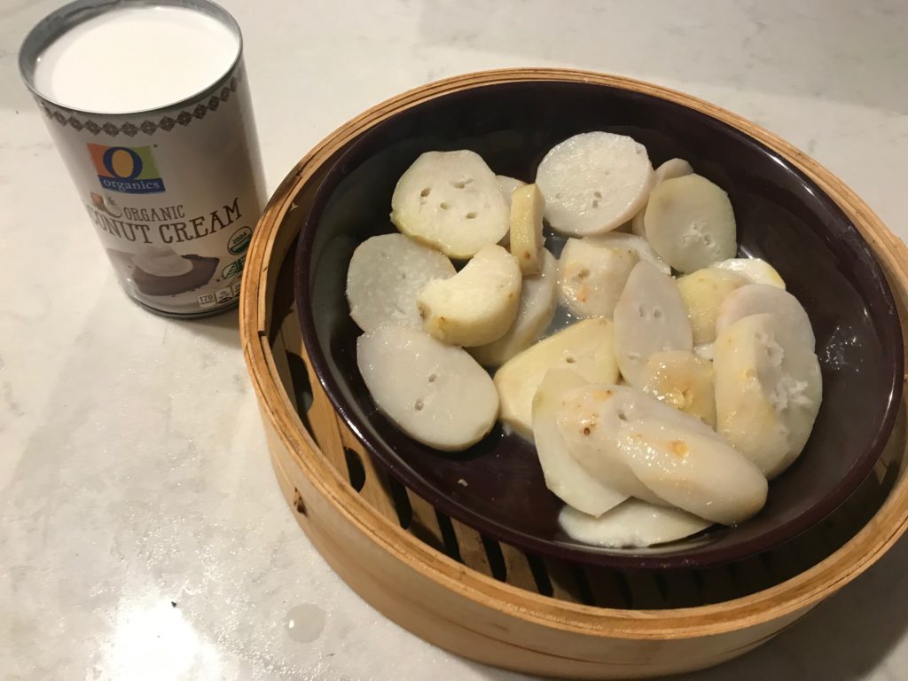 • Step 1: Cut taro into pieces (300g after peeling skins), steam till soft