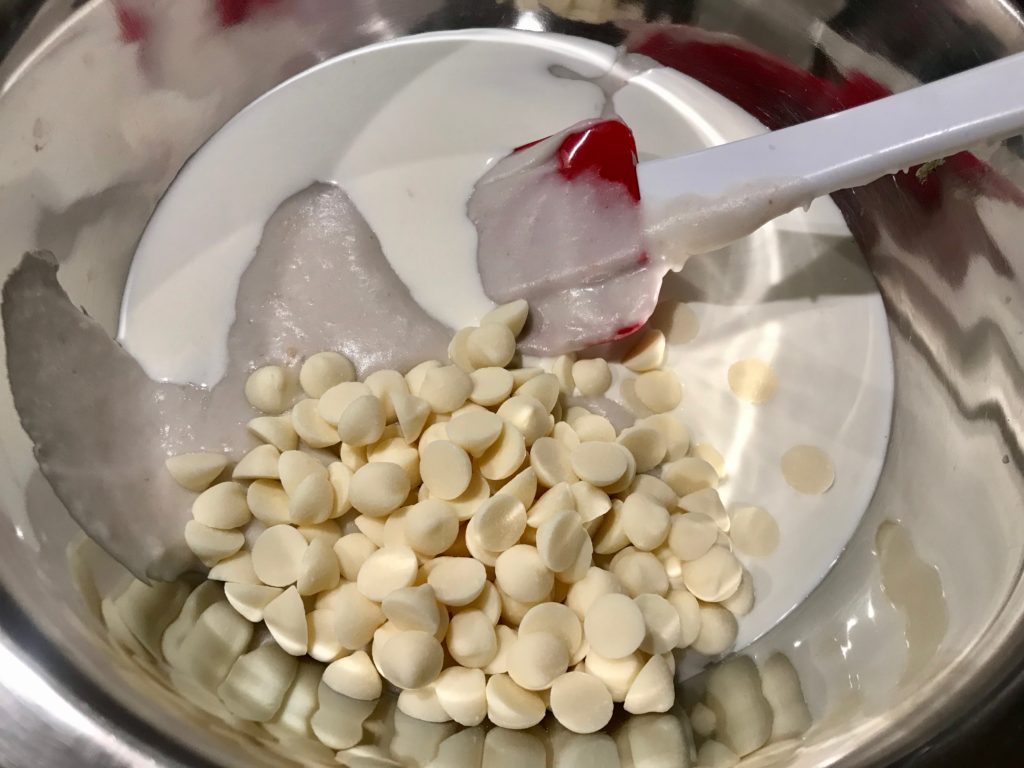 • Step 3: Add 60g light whipping cream, 90g white chocolate chips, 3 drops red color, 2 drops blue colors and taro-coconut cream mixture into a large bowl.