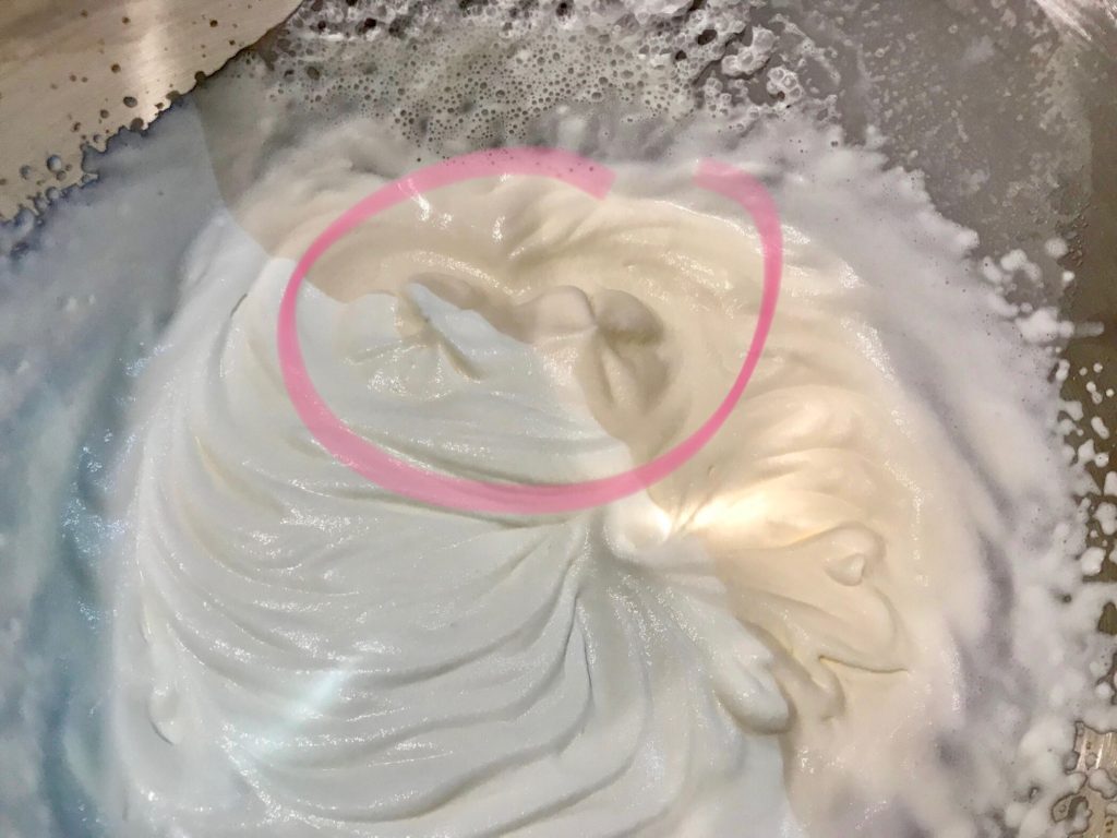 • Step 7: Whisk 100g heavy whipping cream till small peaks (pink circle) stand and cream is not liquidy anymore.