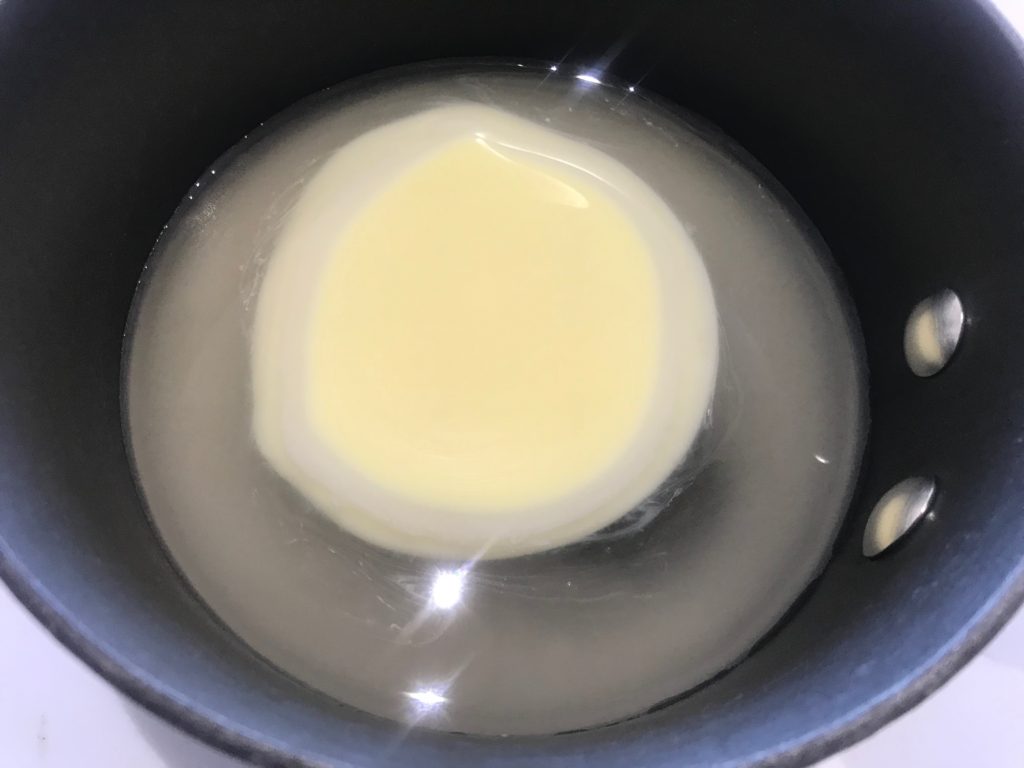 2. Over medium heat, melt and mix 90g sugar, 80g corn syrup, 60g water and 70g condensed milk till just starting to boil with bubbles on the edge. Remove from heat.