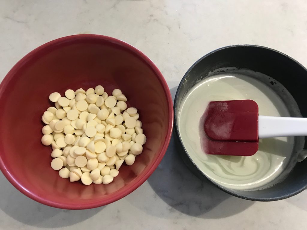 • Step 4: Boil water in a pot and turn temperature to low. Place large bowl on top of pot (hot water should NOT touch the bottom of bowl), gently mix ingredients till all white chocolate chips melt.