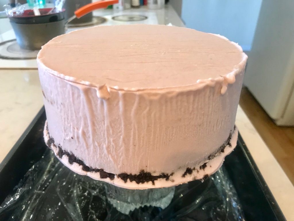 • (Step 6): I have extra taro mousse and the Oreo cookie base was very loose, so I used the leftover taro mousse as glue for the base and poured them all on.