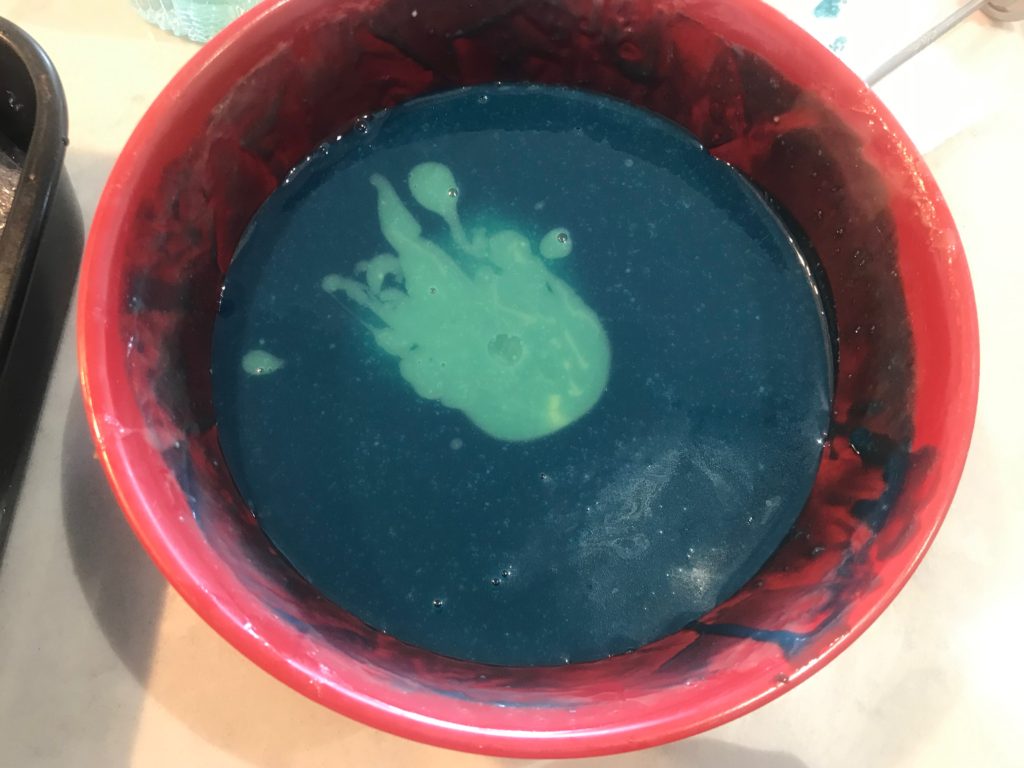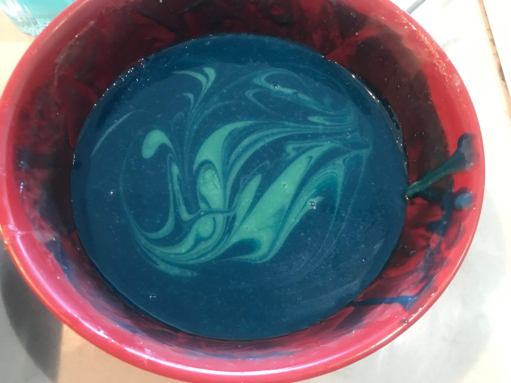 • Use the spatula to gently swipe through the glaze to blur the purple, dark red and teal boundary