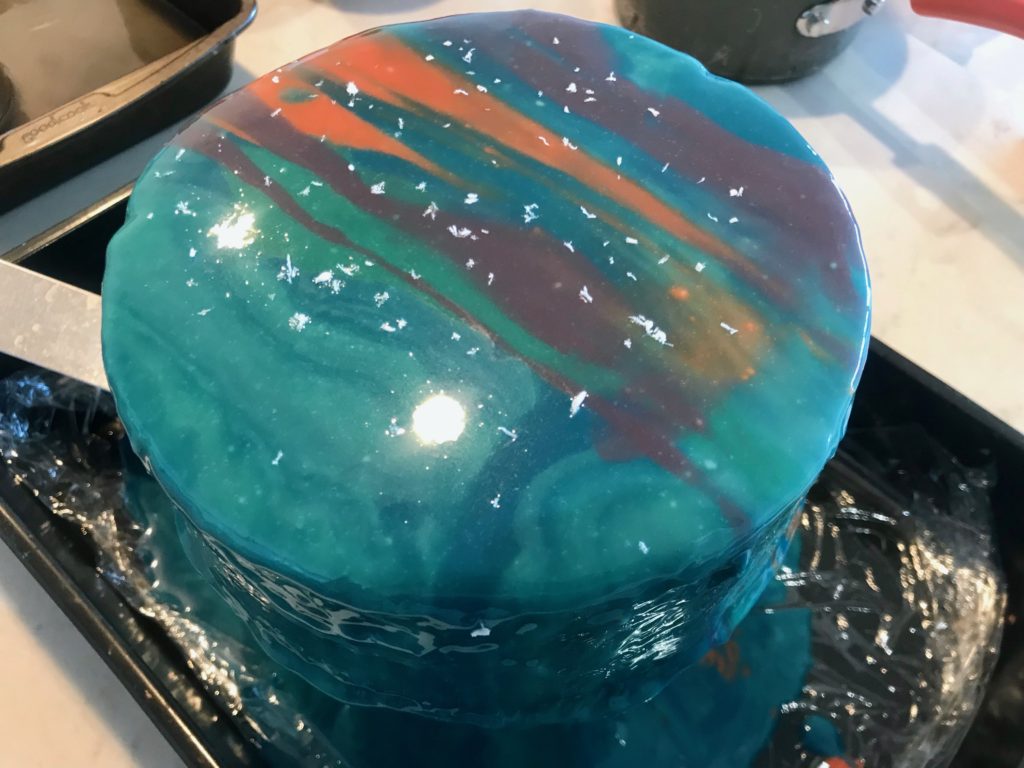• Maintain colored mirror glaze at 32-35C, can place their containers in warm water bath. Temperature too high, mirror glaze will be too flowy, too low will be too chunky and cannot form or shape into expected pattern.