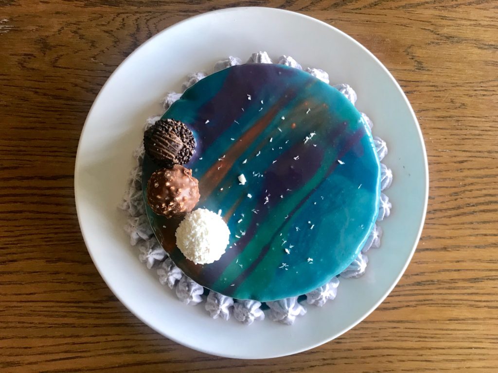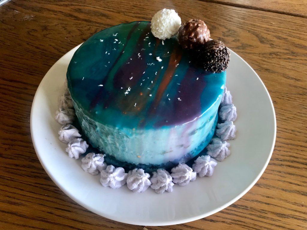 • The blue color on cake wall was much lighter than the previous cake photo, again, no gelatin in mirror glaze, it cannot hold onto the cake.