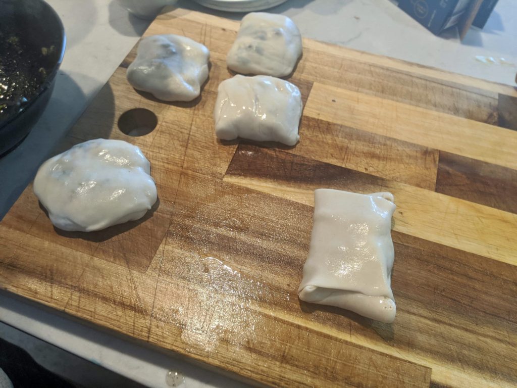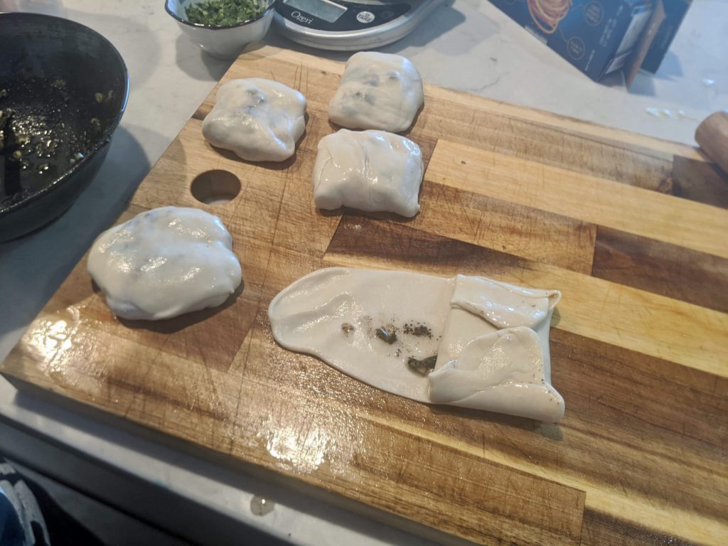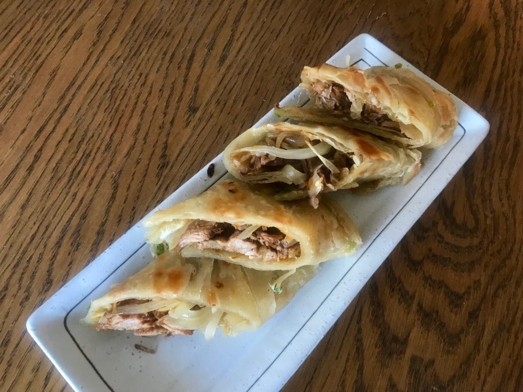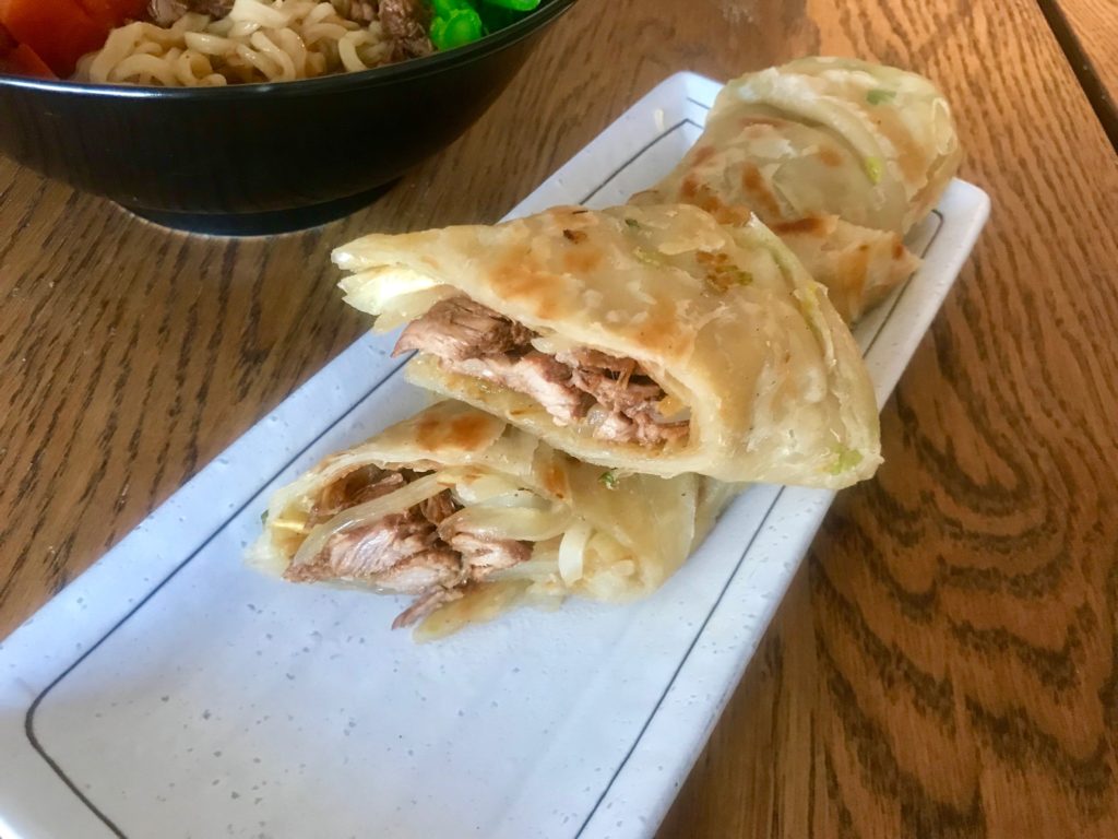 7. Remove from pan, roll in beef, caramelized onion and cilantro. HOT! Do not burn yourself~