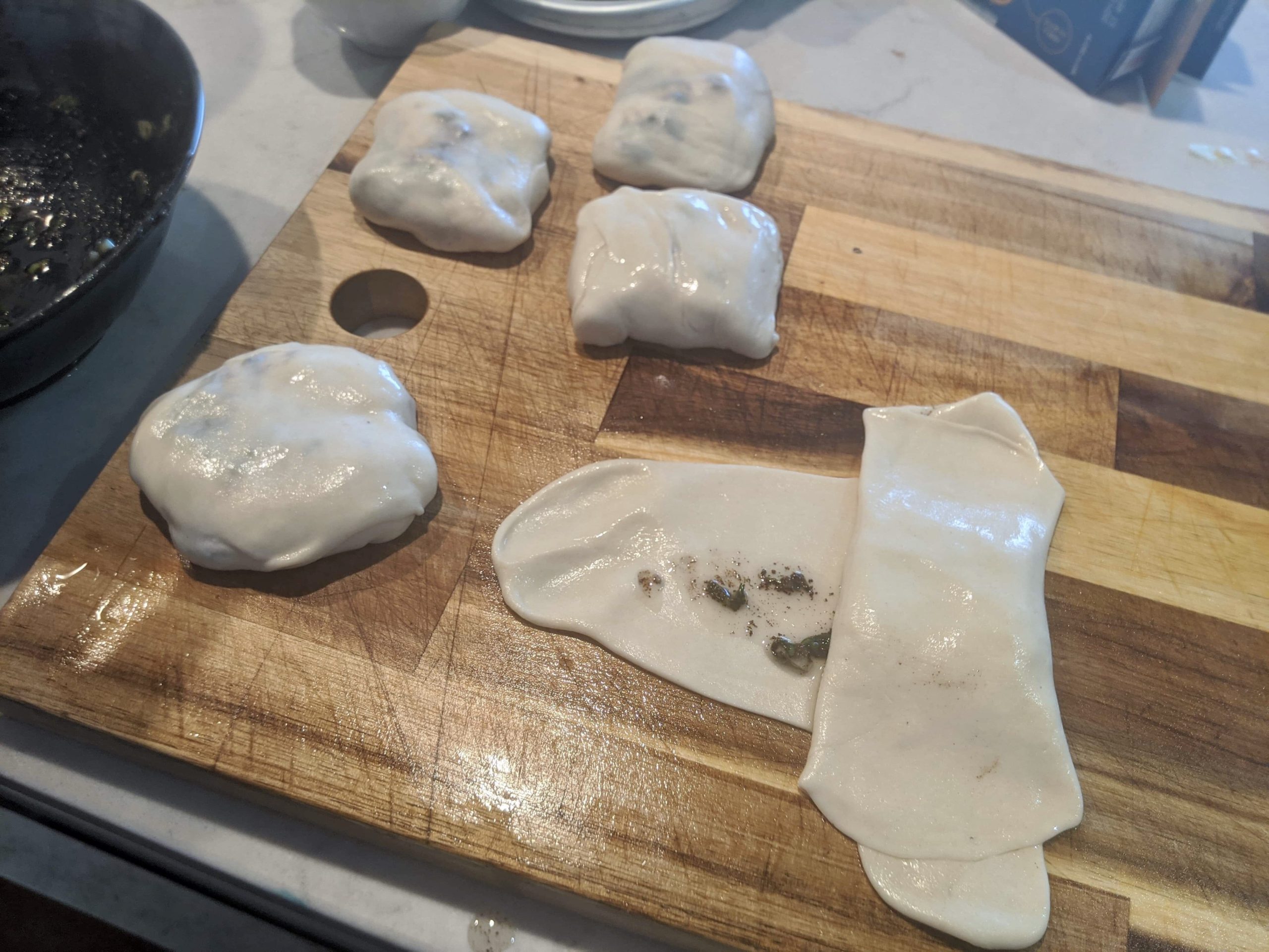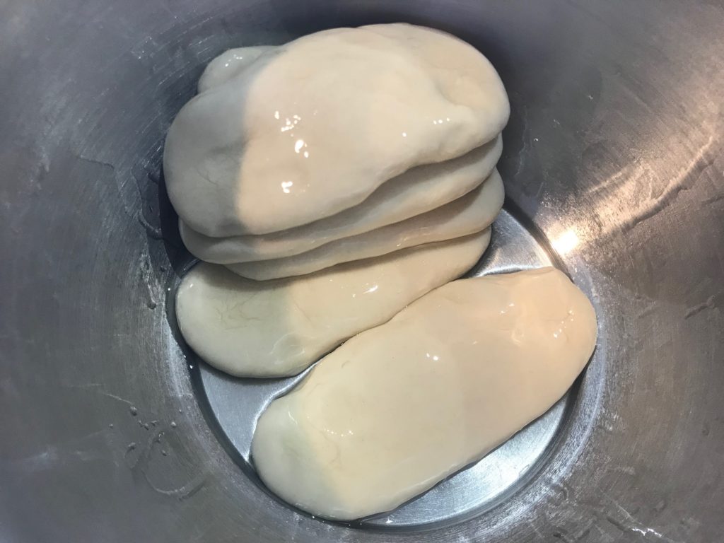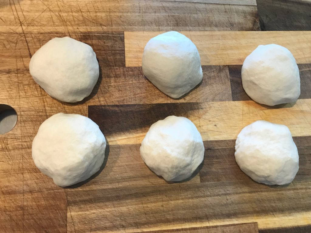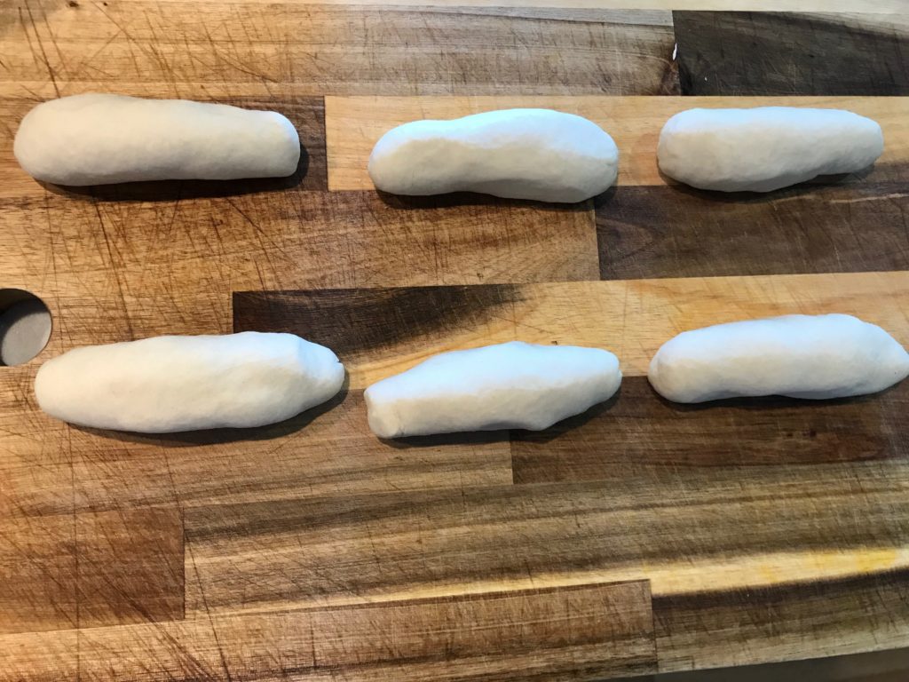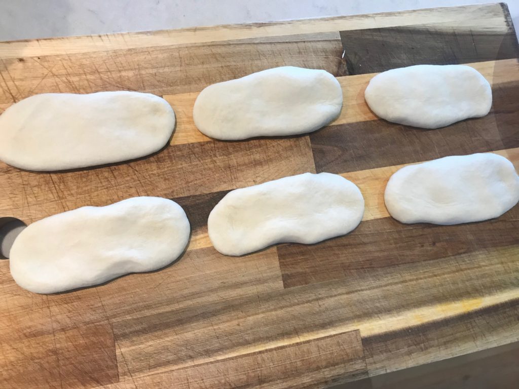 6. Divide dough into 6 pieces, reform from sphere/bun shape to cylinder/sausage shape to long flat oval dough shape.