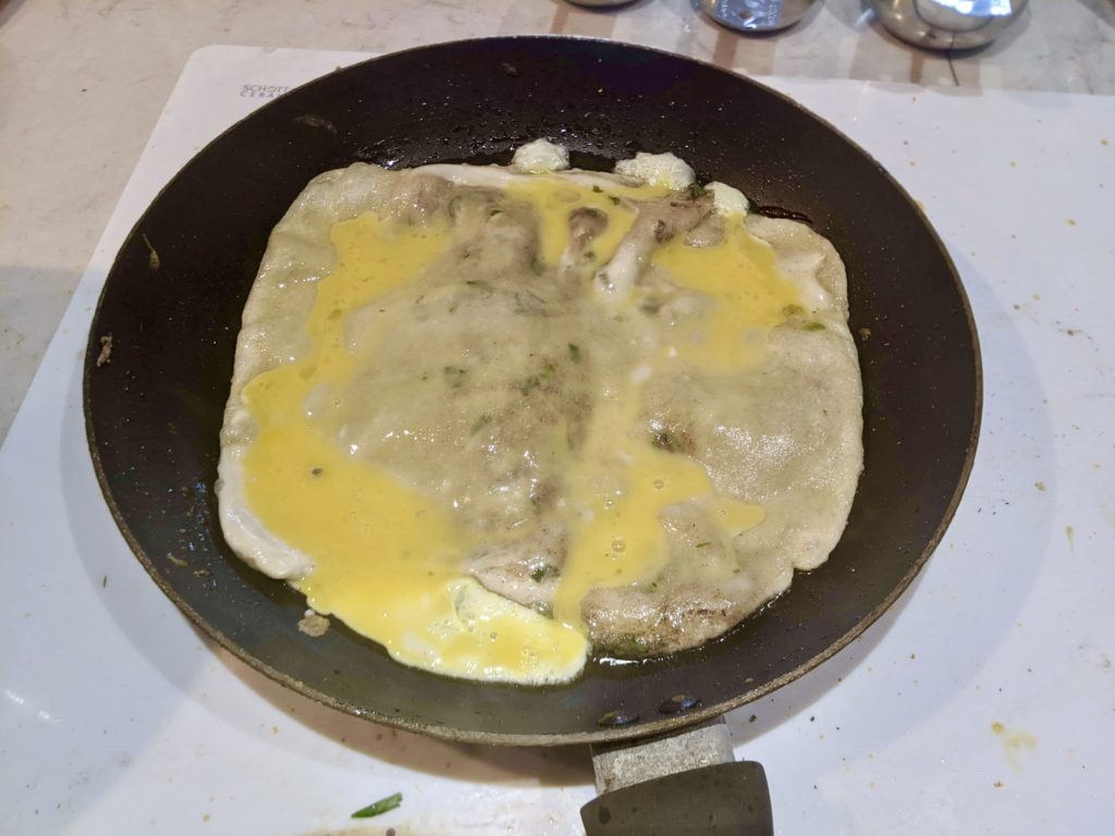 5. (If wants egg on the scallion pancake like 煎餅果子 savory chinese crepe style~), whisk 2 eggs, pour some egg on pancake as photo below