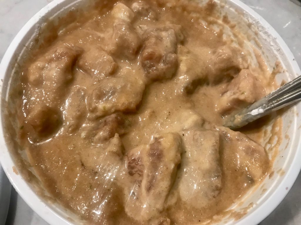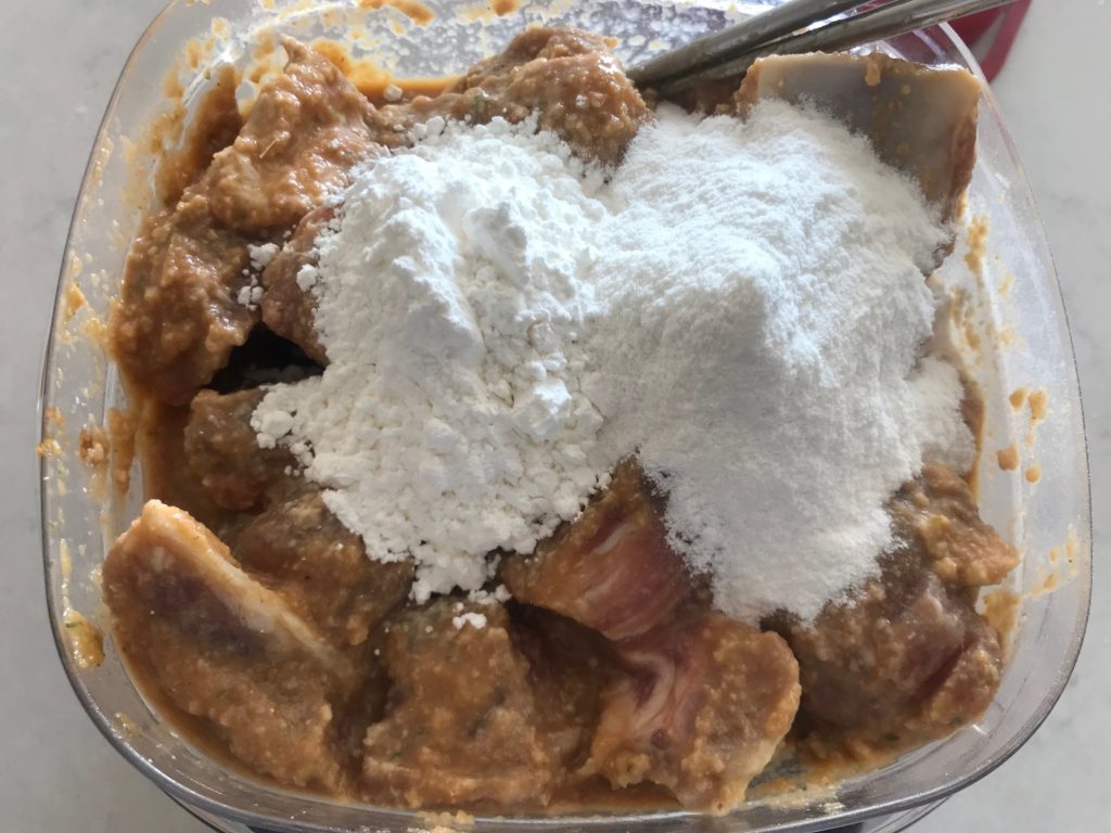 Step 3: when ready to air-fry, take out from fridge, add 30g corn starch and 30g glutinous rice flour, mix well!