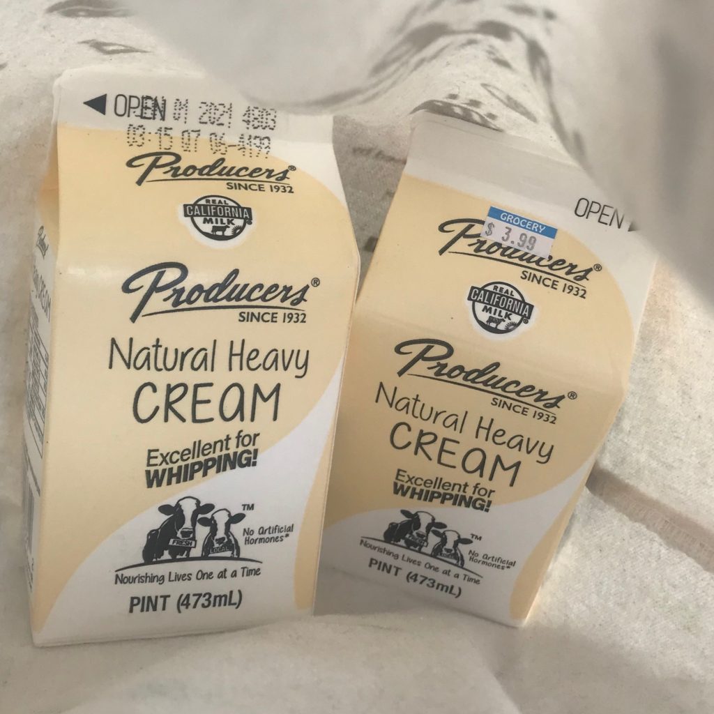 - Whip 40g sugar + 400g heavy whipping cream till soft peak forms (70-80% whipped)