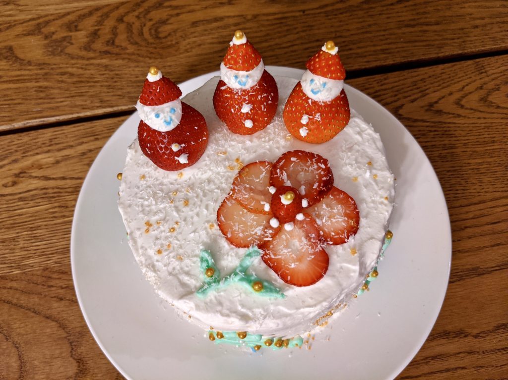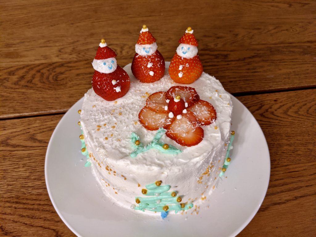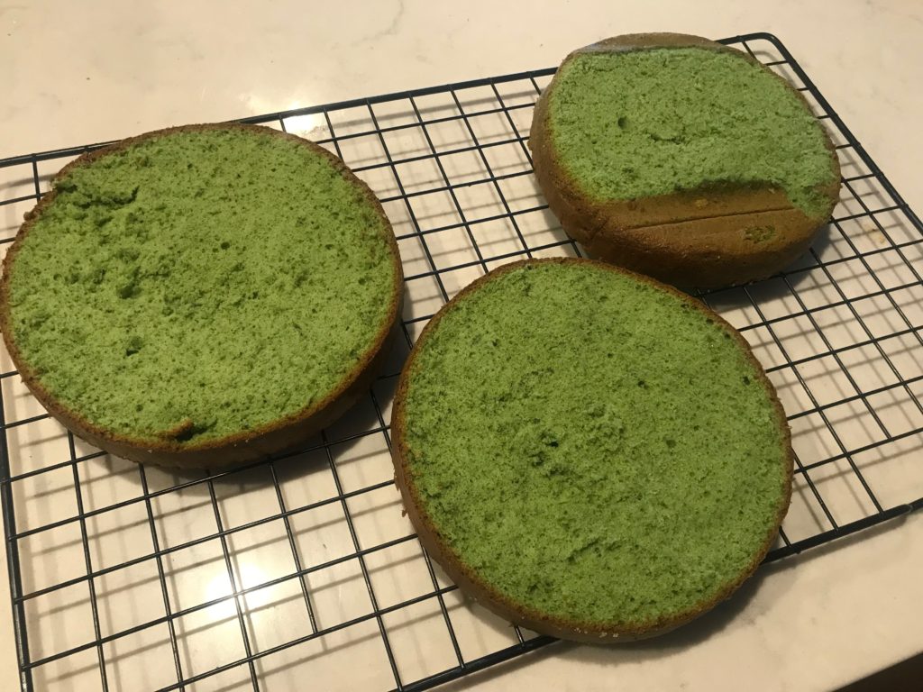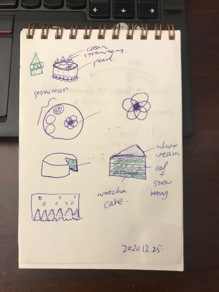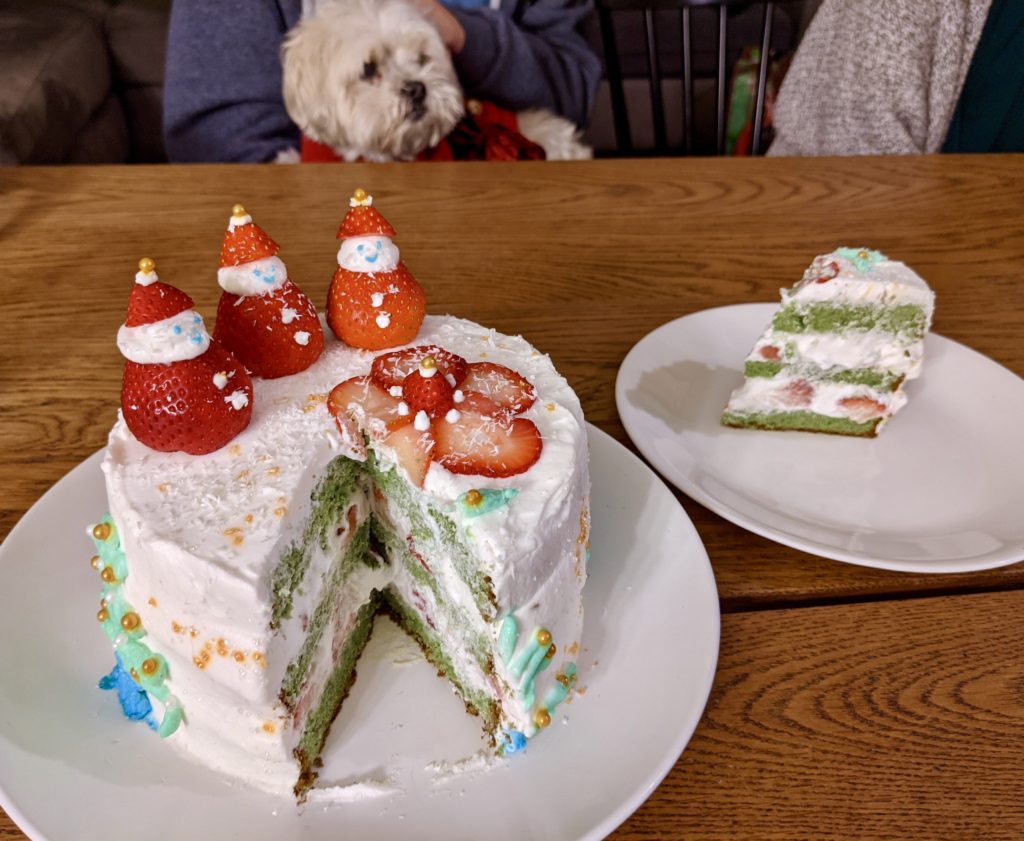 Merry Christmas!! This was a special Christmas that everyone in the apartment stayed back and did not fly home because of the pandemic. There was no tree in the apartment nor other decoration. To make the holiday festive, I made a cake inheriting Christmas color green and red, hence matcha and strawberry cake, and I made up for real Christmas tree with piped Christmas trees on the cake 🙂