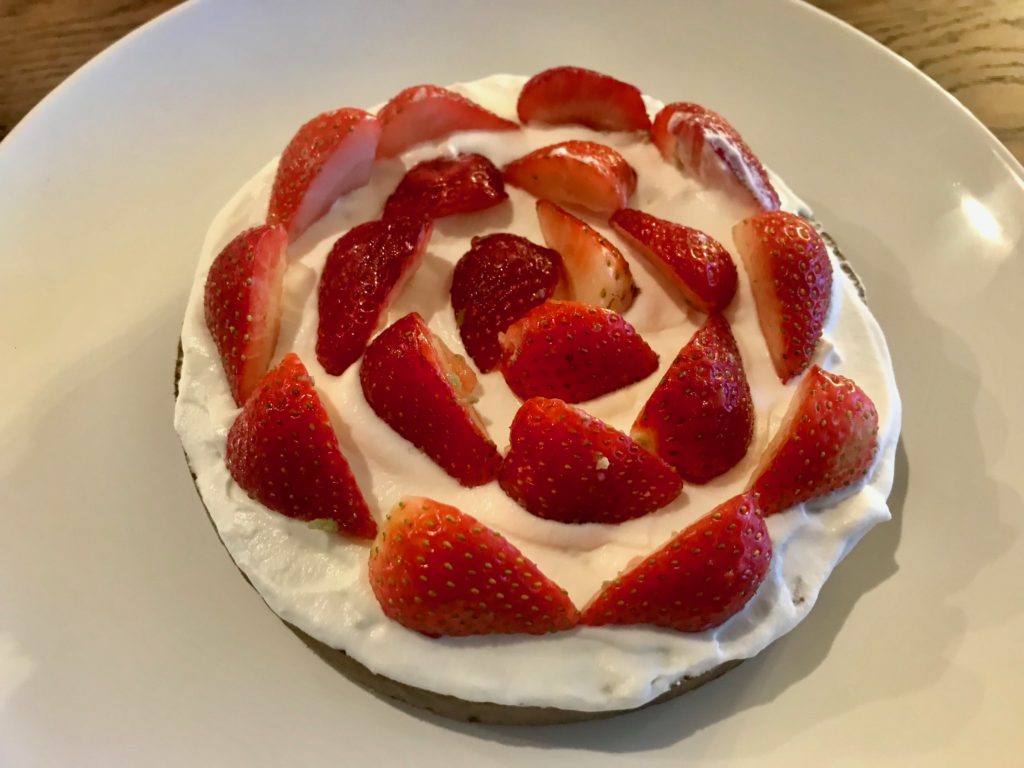 - Place a layer of cream on cake, place strawberries, cover strawberries with more cream; repeat.