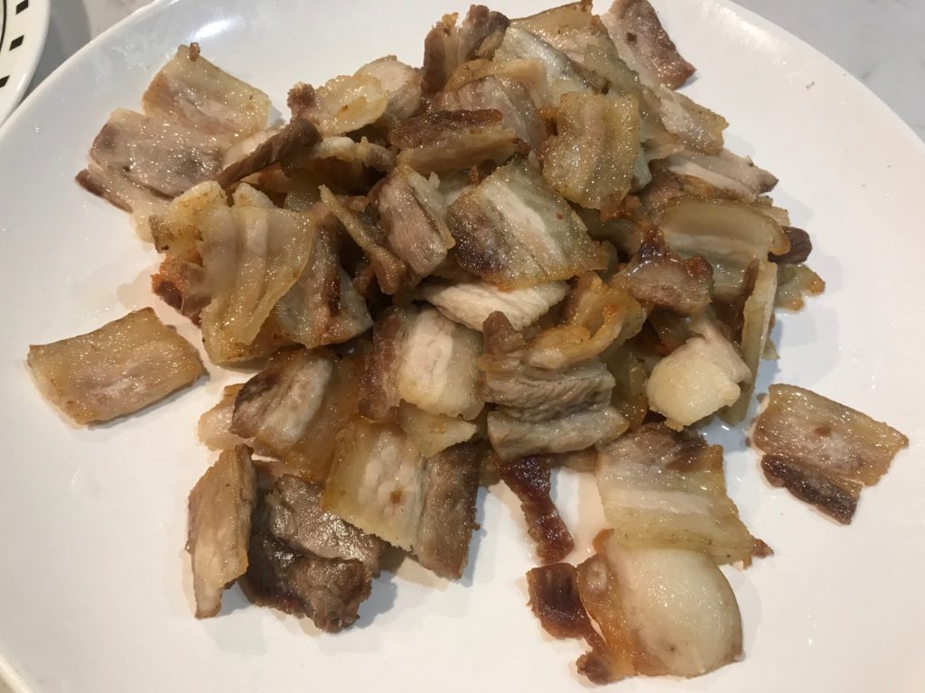 - stir fry pork belly in low heat on pan to get the oil out, need to be very patient at this step; if cook over high heat, pork belly burns easily and the oil does not get out, resulting in very oily, greasy twice-cooked pork