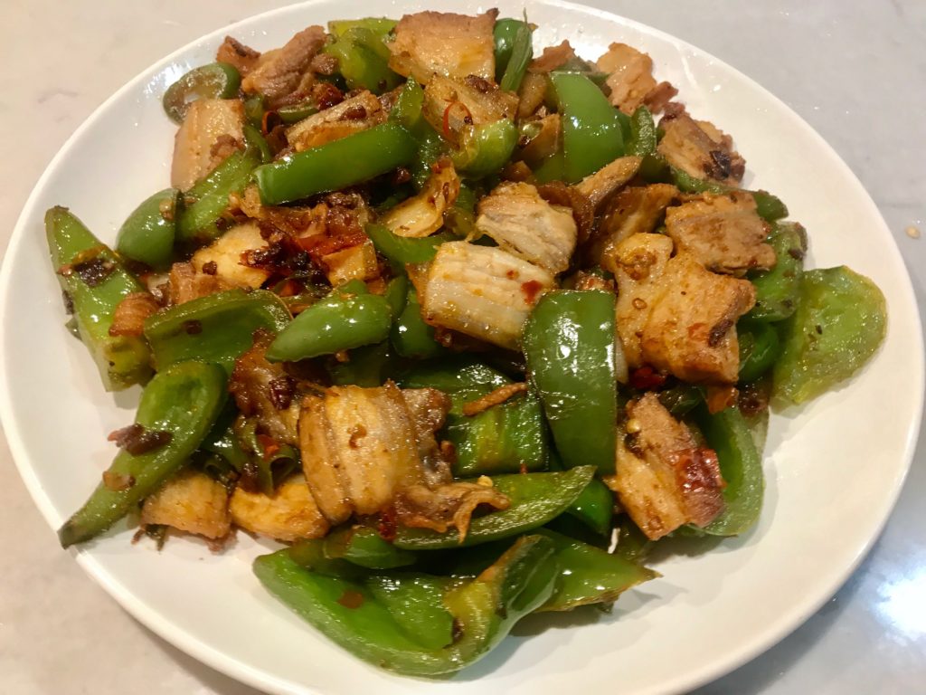 Another very classic Szechuan dish is twice-cooked pork — first cook in mid-low water for 20-30min, second-cook in pan for stir fry. Traditional twice-cooked pork is cooked with garlic sprouts 蒜苗, but if unable to find this, bell pepper is usually used instead. Sweetness of bell peppers compensate the spicy, crispy pork belly very well!