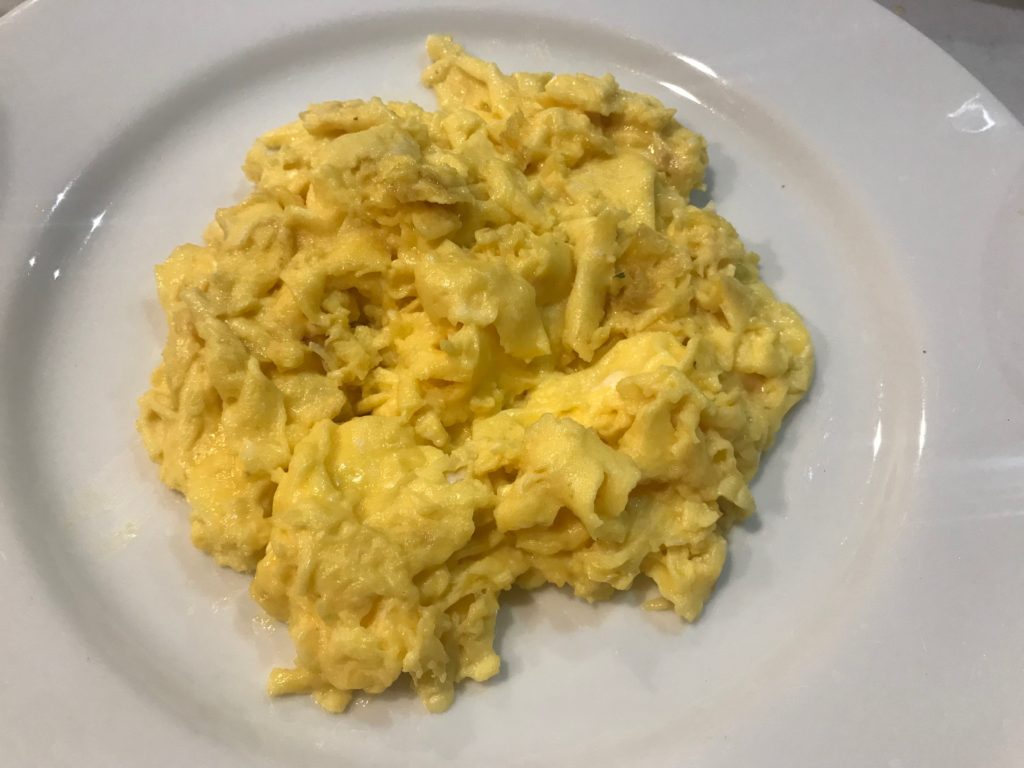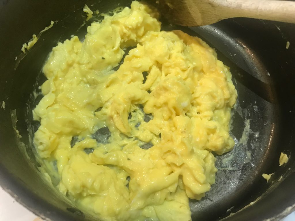 Step 4: stir fry egg on oil over mid heat, starch in dashi soup of egg yields smooth, “slippery” texture of egg; do not need to fully cook the egg; remove from pan