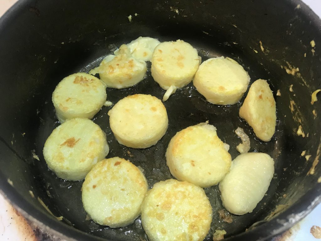 Step 2: coat tofu slices with corn starch, fry over oil on mid-low heat on both sides and have golden crispy skin