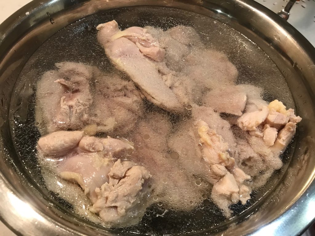 Step 4: in another pot, bring water with ginger slices, scallion chunks, rice wine to boil; cook chicken thighs for 30secs; bring out and dip in ice water so the skin becomes chewy~ you will see “goose”bumps on chicken skin 🙂