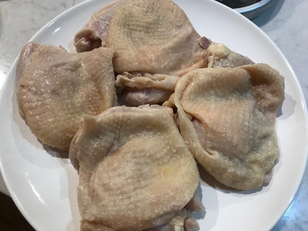 - raw chicken thighs should quick dip in boiling water for 30secs and place in ice water right away to have chewy skin
