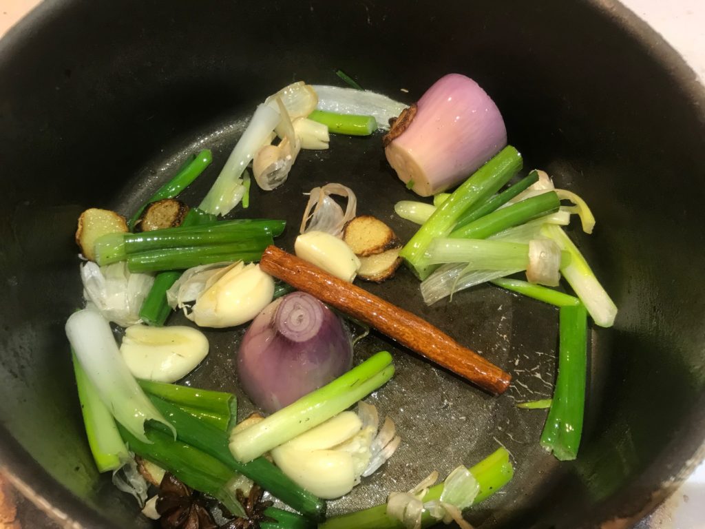 Step 2: stir fry scallion chunks, garlic cloves, shallot halves, 2-3 star anises, 1 cinnamon till fragrance comes out