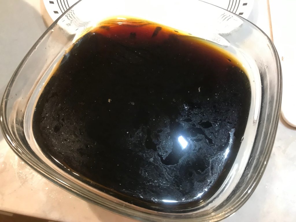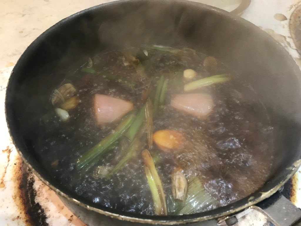 Step 3: add 1 bowl of water, 1.5 bowls of soy sauce 生抽, 0.5 bowl of traditional soy sauce 老抽, and rock sugars to pan; bring to boil and cook in mid heat for 3 minutes