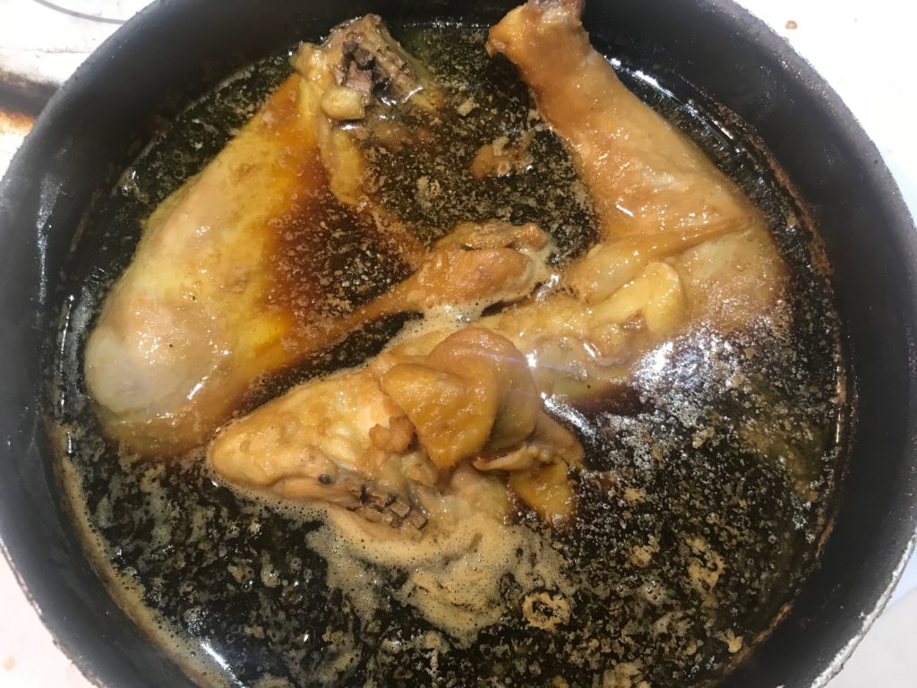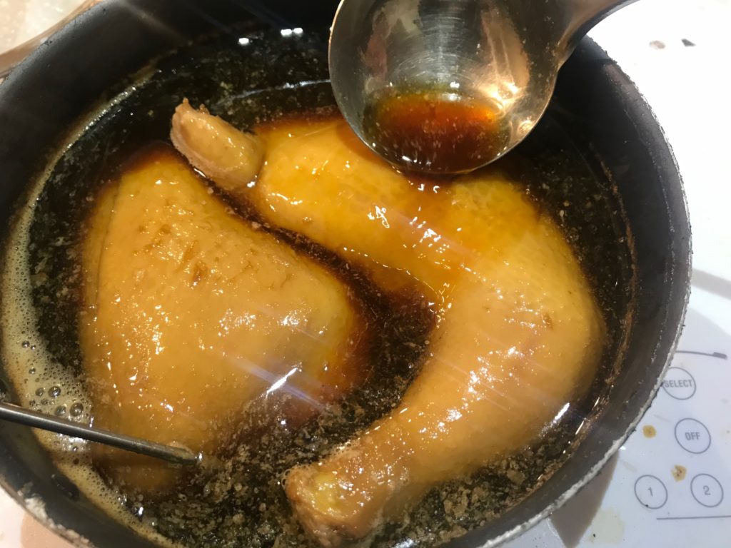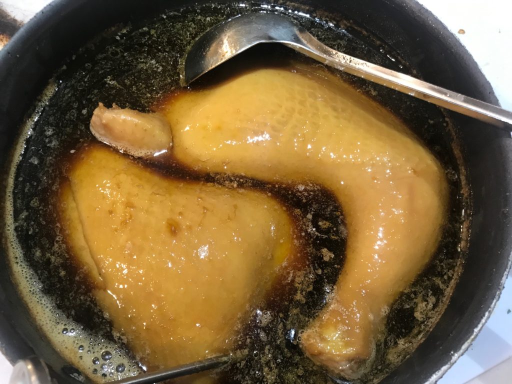 Step 5: transfer chicken thighs to soy sauce pot, skin faces up. Scoop sauce and pour on chicken thigh skin for darker color for 15mins. Temperature should maintain 70-90C the whole time!!