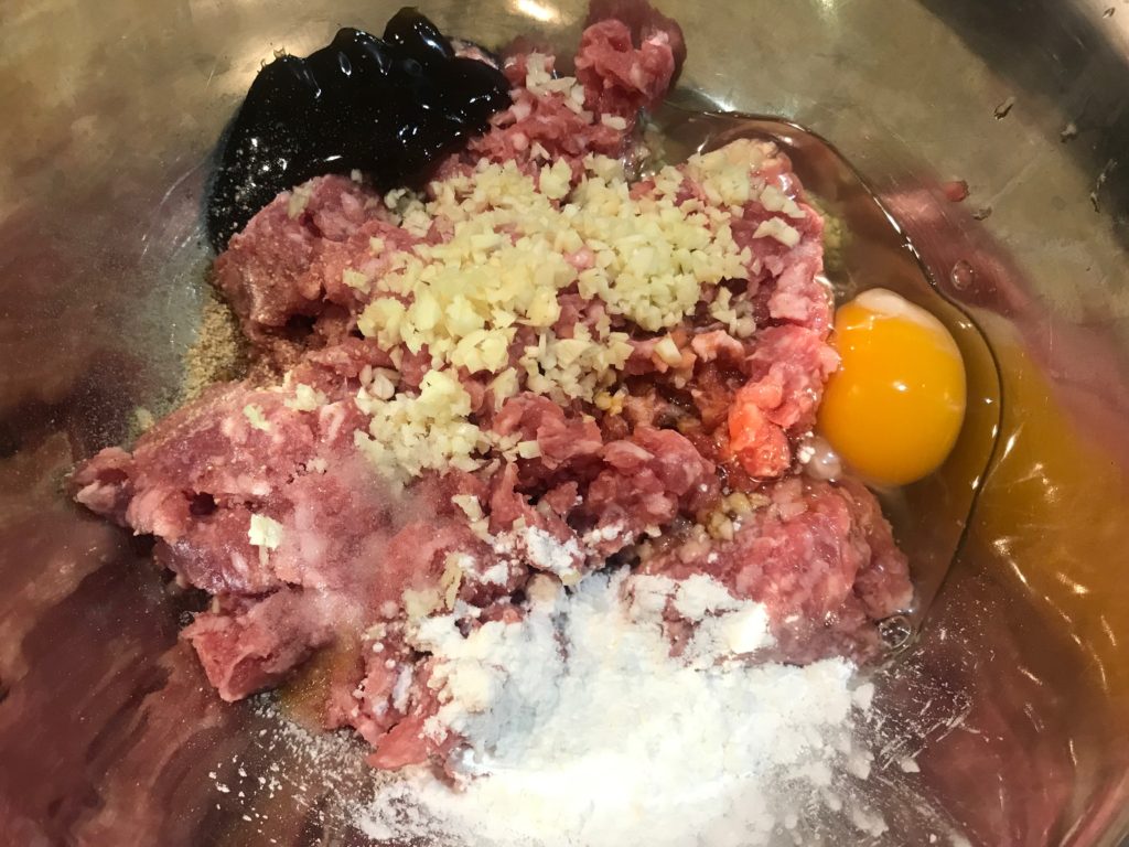 Step 3: marinate 300g ground pork with minced garlic cloves, 1 tbsp soy sauce, 1 tbsp oyster sauce, 1 tbsp flatfish powder, 2 egg yolk, salt, 4g white pepper powder, 1 tbsp corn starch, 1 tbsp sesame oil; mix well and rest in fridge for more than 10mins.