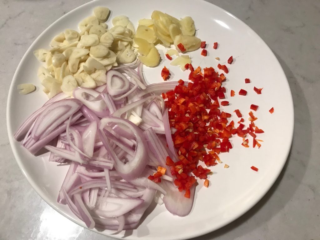Step 1: slice 1 whole garlic, or just peel or skin and smash it; slice ginger, slice 2 whole shallots or just peel them and cut in halves; slice or fine chop 1 red pepper if you want a spicy kick; slice shiso leaves.