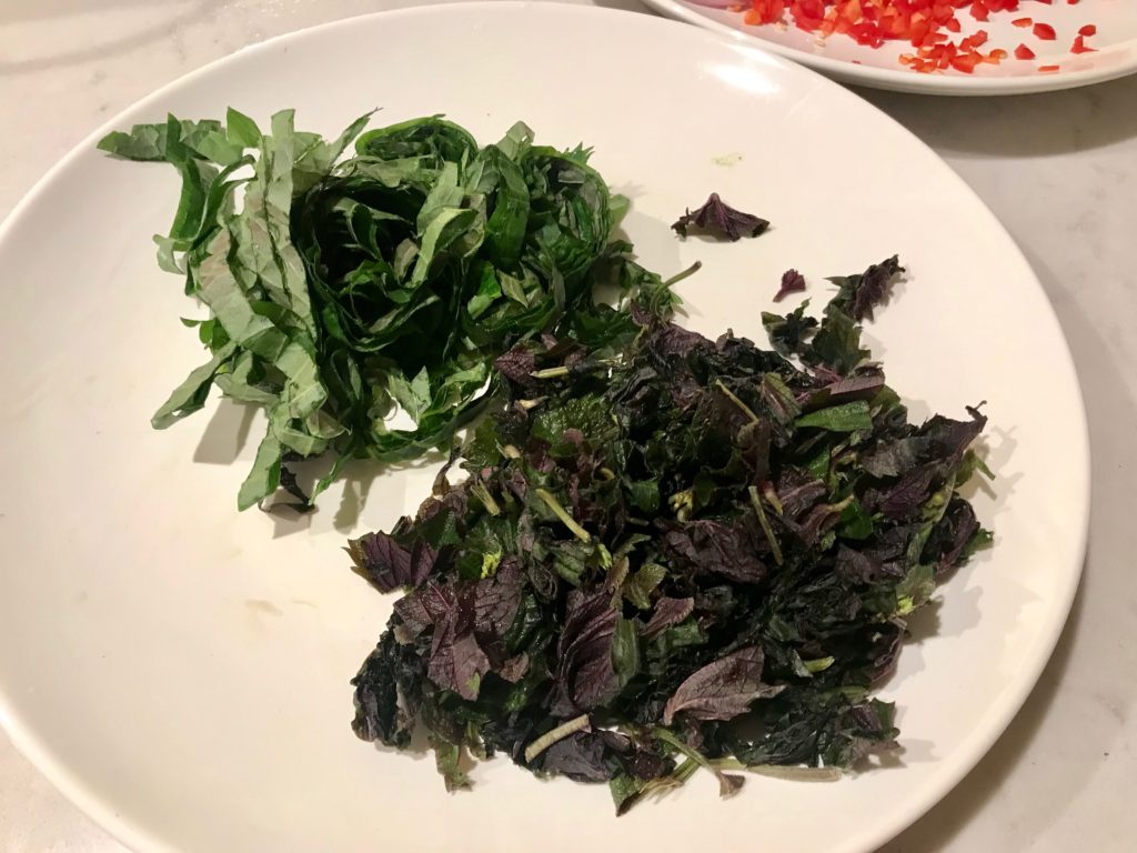 I would also like to share a bit more about shiso leaves. Besides in Chinese foods, I also had sushi/sashimi with shiso leave, tempura shiso leave. Shiso leaves also seem to be used for drinks as well! Its versatility encouraged me to nerd it out and to figure out the differences, similarity between Chinese Zisu (紫蘇), Japanese shiso leaves (紫蘇/シソ) and Korean sesame leaves ggaetnip (깻잎) or soyeop (소엽). According to my eyes, Chinese Zisu is almost purple on both sides, Korean ggaetnip/soyeop is almost green on both sides, with slight shades of purple on the back of leaves; according to my taste buds, Chinese Zisu and Korean ggaetnip taste totally different both raw and cooked — Zisu has a strong, distinct flavor, ggaetnip/sesame leaves have mild flavor, slight bittersweet; according to Wikipedia, Chinese Zisu is the same as Japanese shiso leaves, the Chinese name “Zisu” 紫蘇 (purple perilla) is actually the origin of the Japanese name “Shiso”; according to other food blogger ChopstickChronicles.com, shiso leaves look similar as korean perilla leaves but taste different. “Shiso leaf is shaped like a spade with a serrated edge, whereas Korean perilla also known as sesame leaves is more flatter and have a less serrated edge“.