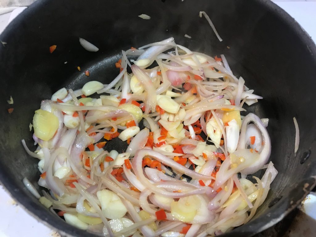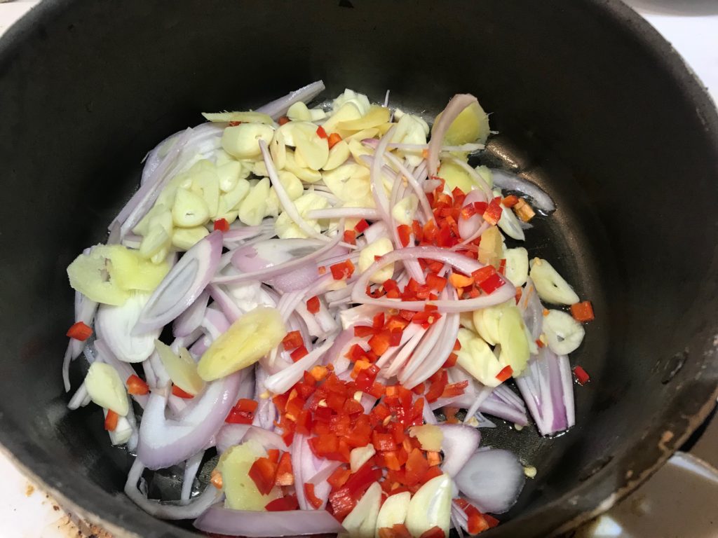 Step 2: over medium-high heat, heat up oil, stir fry garlic, ginger, pepper, shallots till fragrance comes out, shallot becomes transparent and golden.