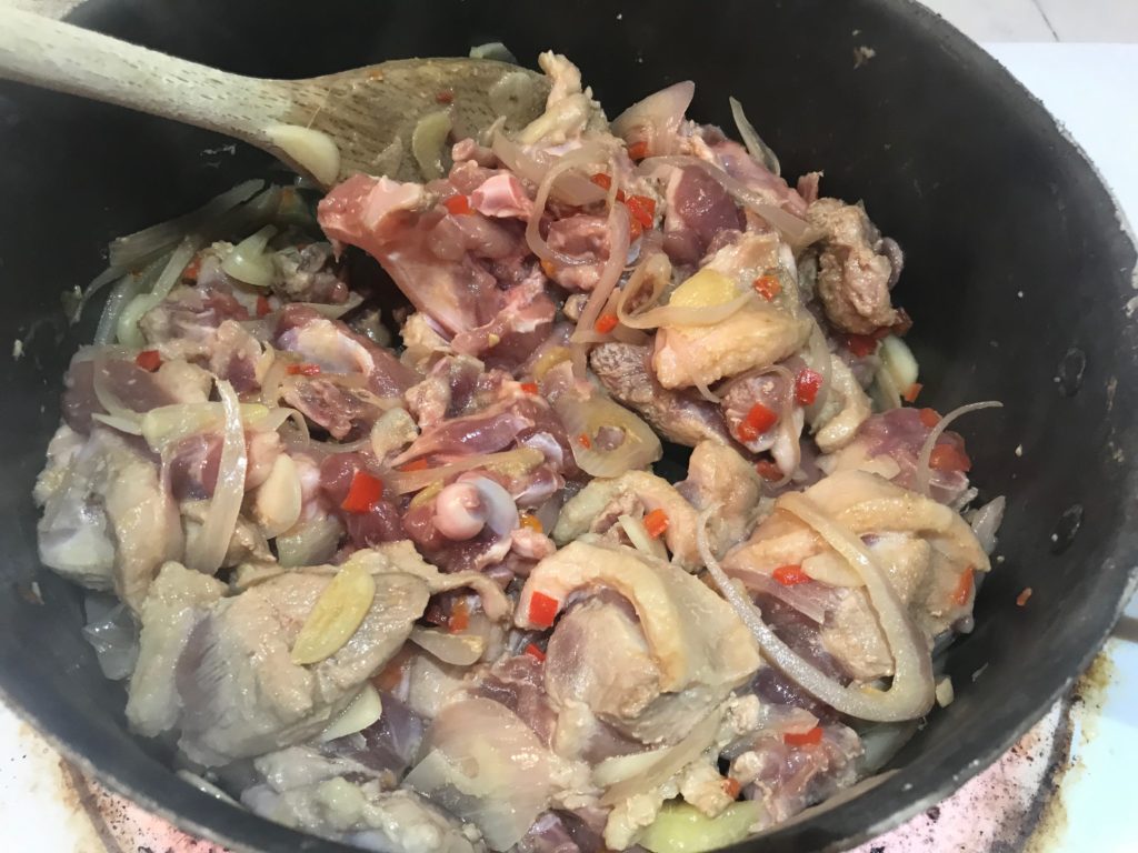 Step 3: add halve duck sliced pieces, Stir fry over high heat. Add 2-3 tbsp rice wine.