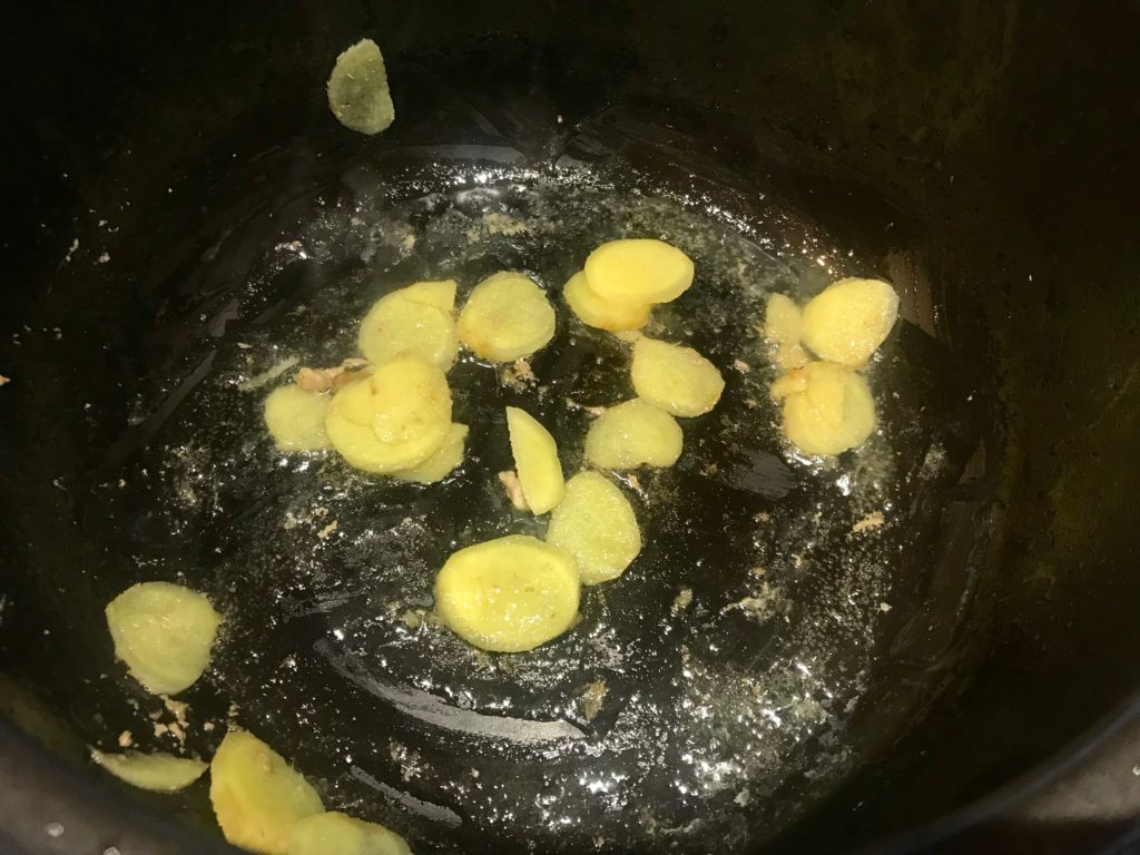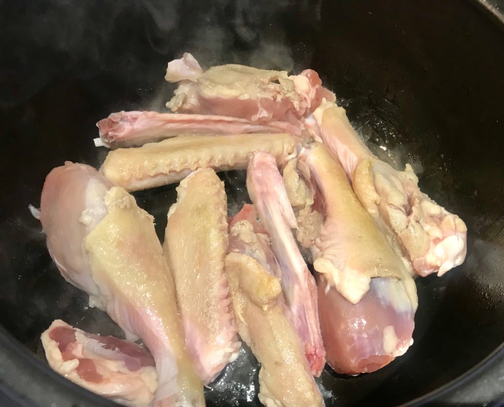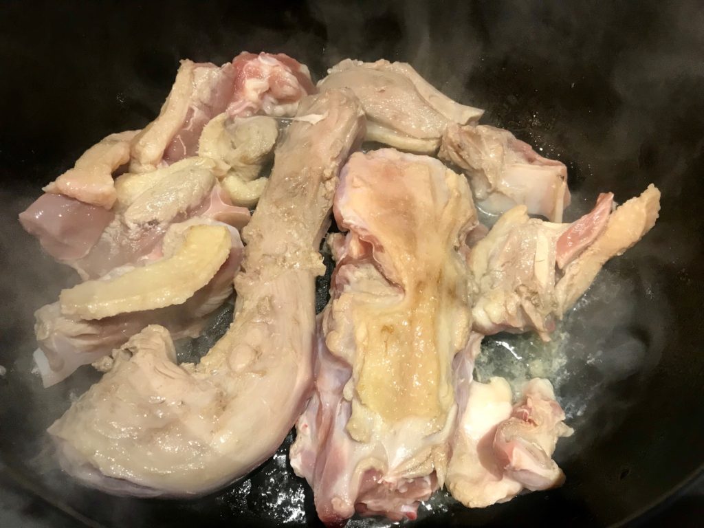 Step 4: remove duck from pot, stir fry ginger slices till golden and fragrance comes out