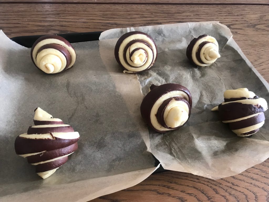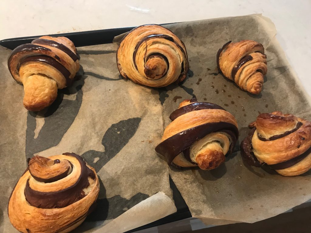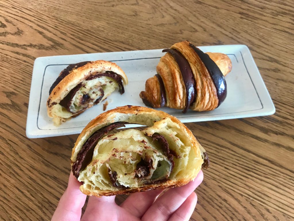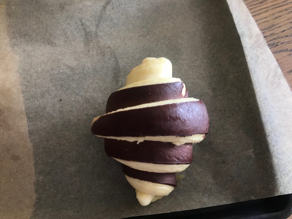 After 6 trials on baking original croissants, I want to get my hands on the “prettier” and slightly “fancier” croissants — colored and flavored ones. This time I am making the chocolate croissants. The chocolate sheet was drier than planned, resulting in some croissant not fully covered in chocolate sheet, and the chocolate layer was a bit too crispy. As usual, as my lab notebook, I have recorded mistakes and takeaway in details here.