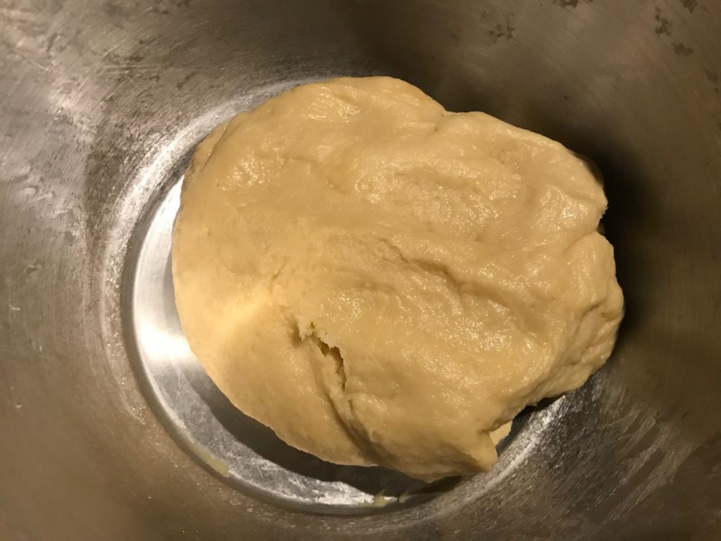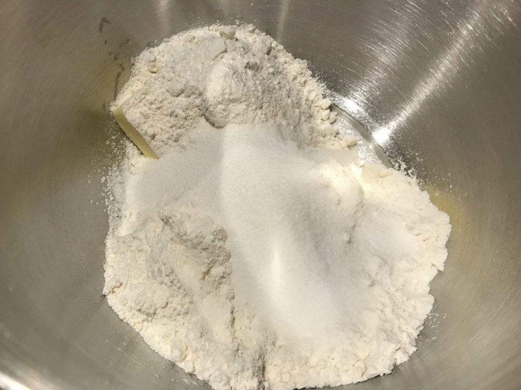 Step 2: mix all ingredients, butter should be added here (instead of add in after all the other ingredients form a dough) to weaken the dough; we do not want a strong dough;