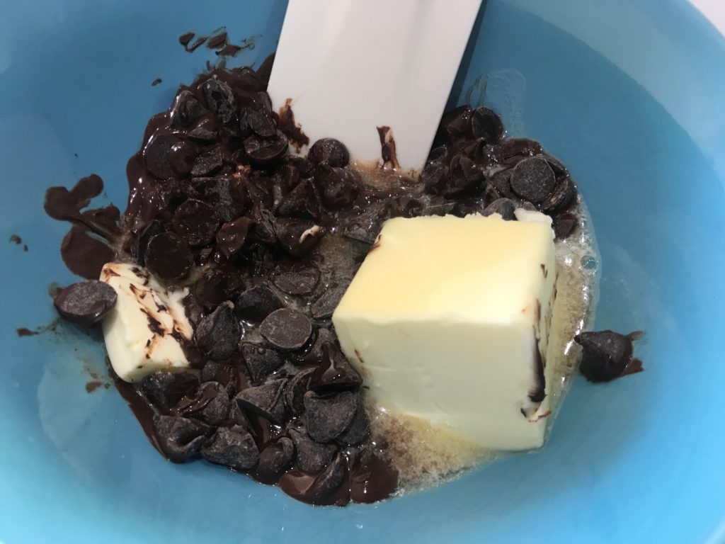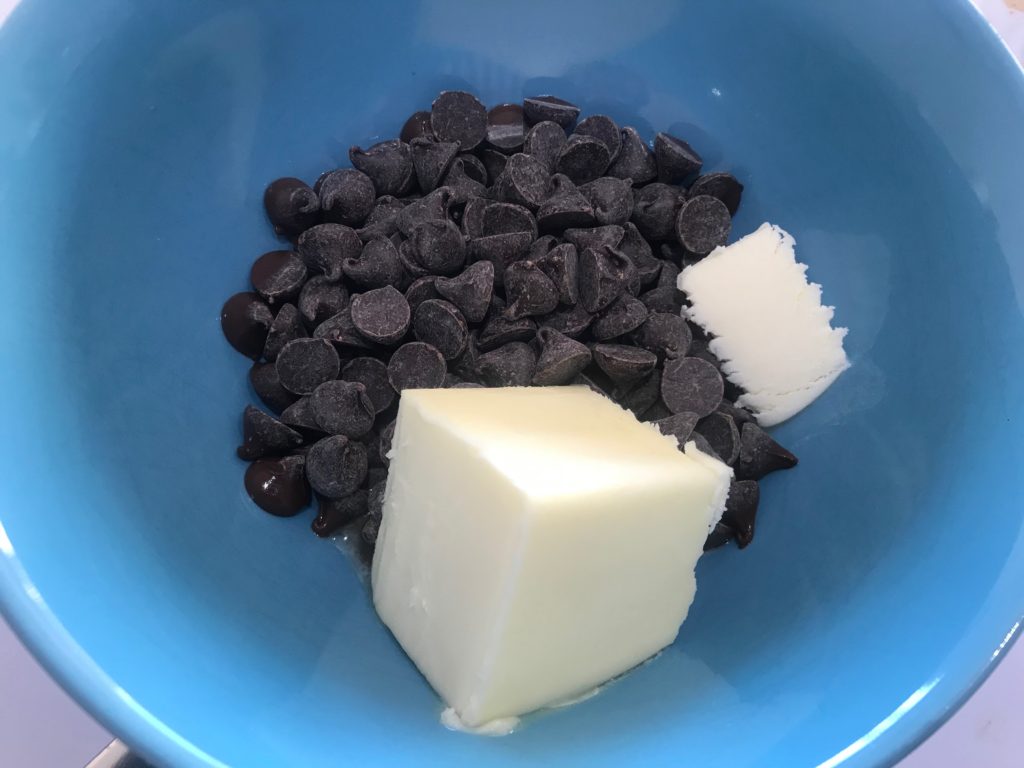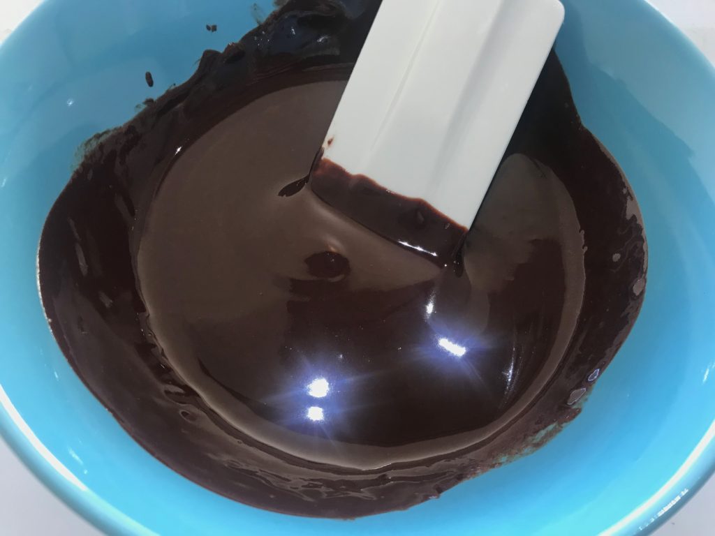- over water bath, melt 100g dark chocolate, 60g unsalted butter