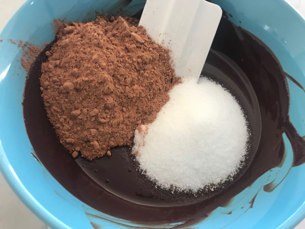 - mix with 40g powder sugar, 21g cocoa powder, pinch of salt
