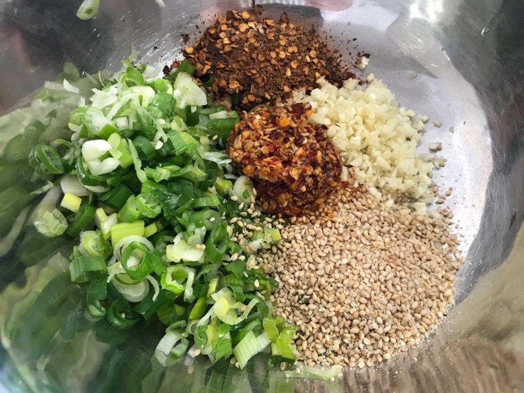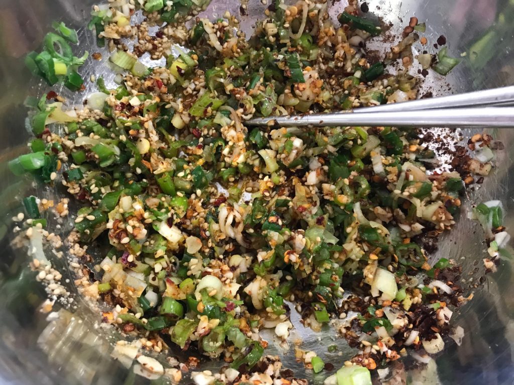 Step 8: Over medium-high heat, heat up oil till smoke rises; pour oil over the mix from last step. Be careful! Mix well.