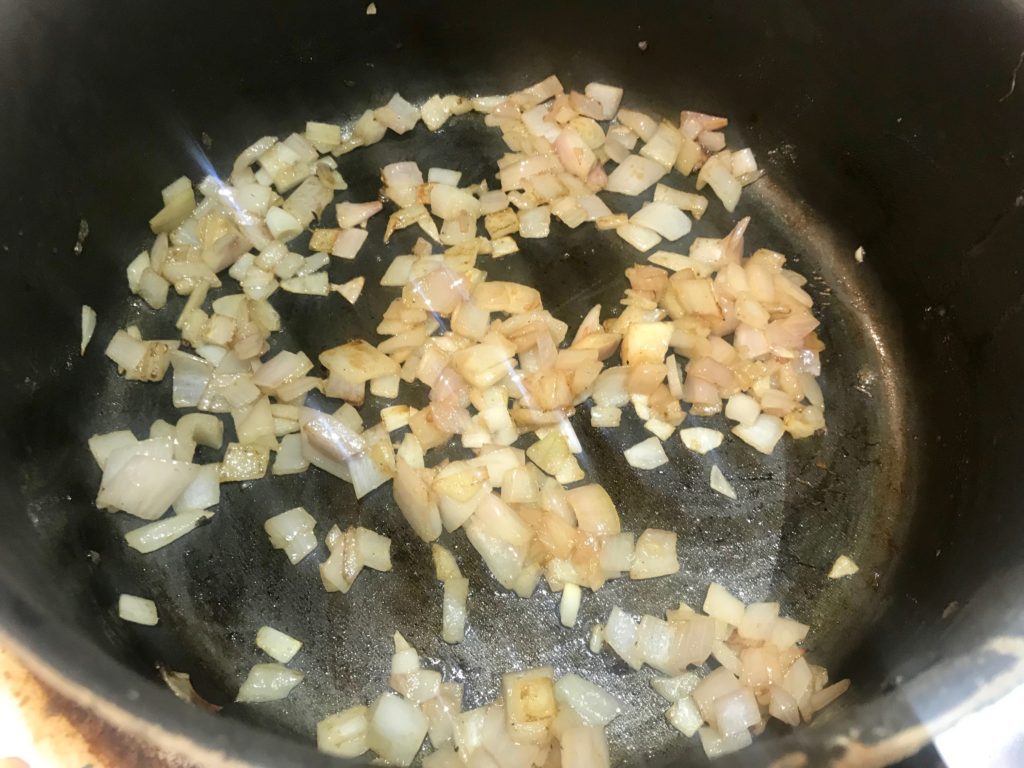 Step3: (if remove mushrooms from step 2, melt another 1/2tsp butter in pan) add finely chopped shallots and stir fry till transparent and golden.