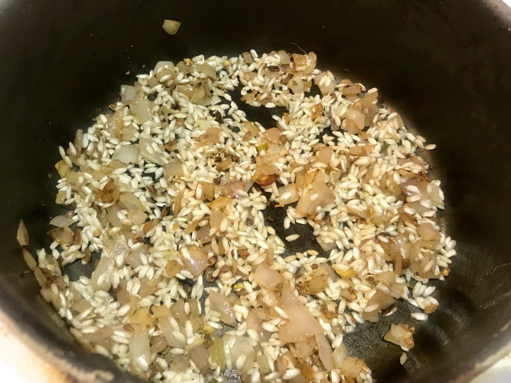 - keep stirring the pot, especially when broth is almost soaked up, to achieve same texture from top to bottom and prevent risotto from burning