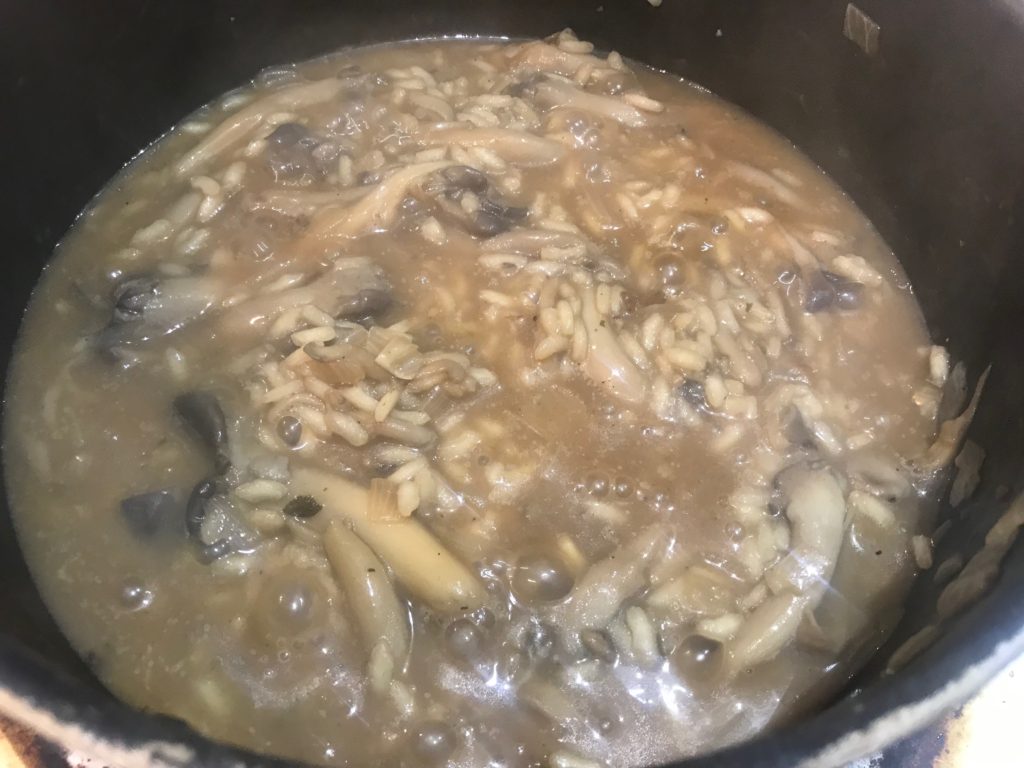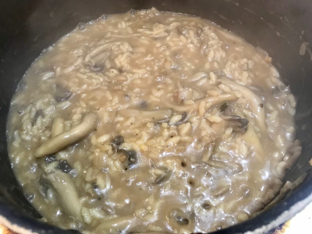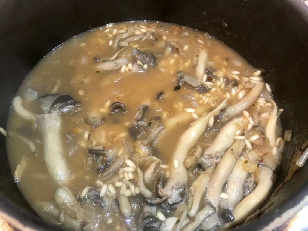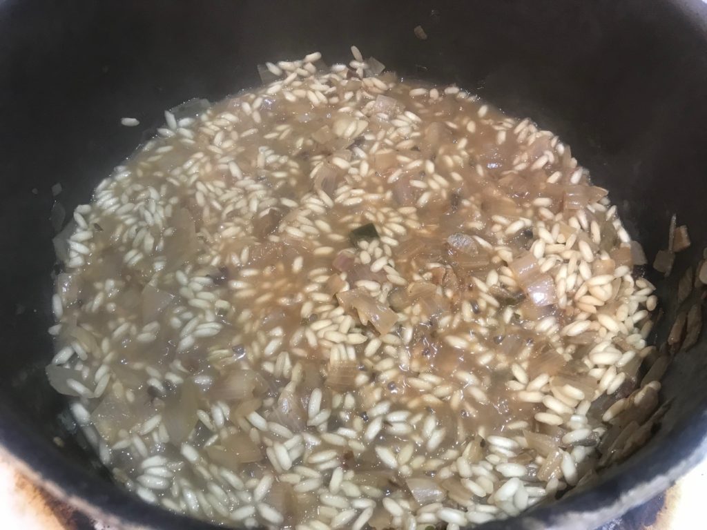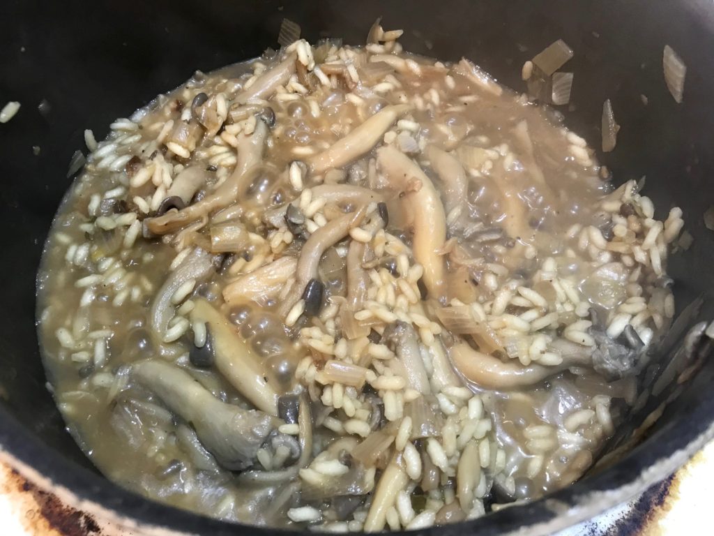 golden shallots rice then white wine 1st cup broth 1st cup absorbed (5-6mins) 2nd cup + mushroom + juice 2nd cup absorbed (7mins) 3rd cup (8mins) 4th cup (<1cup, 5mins)